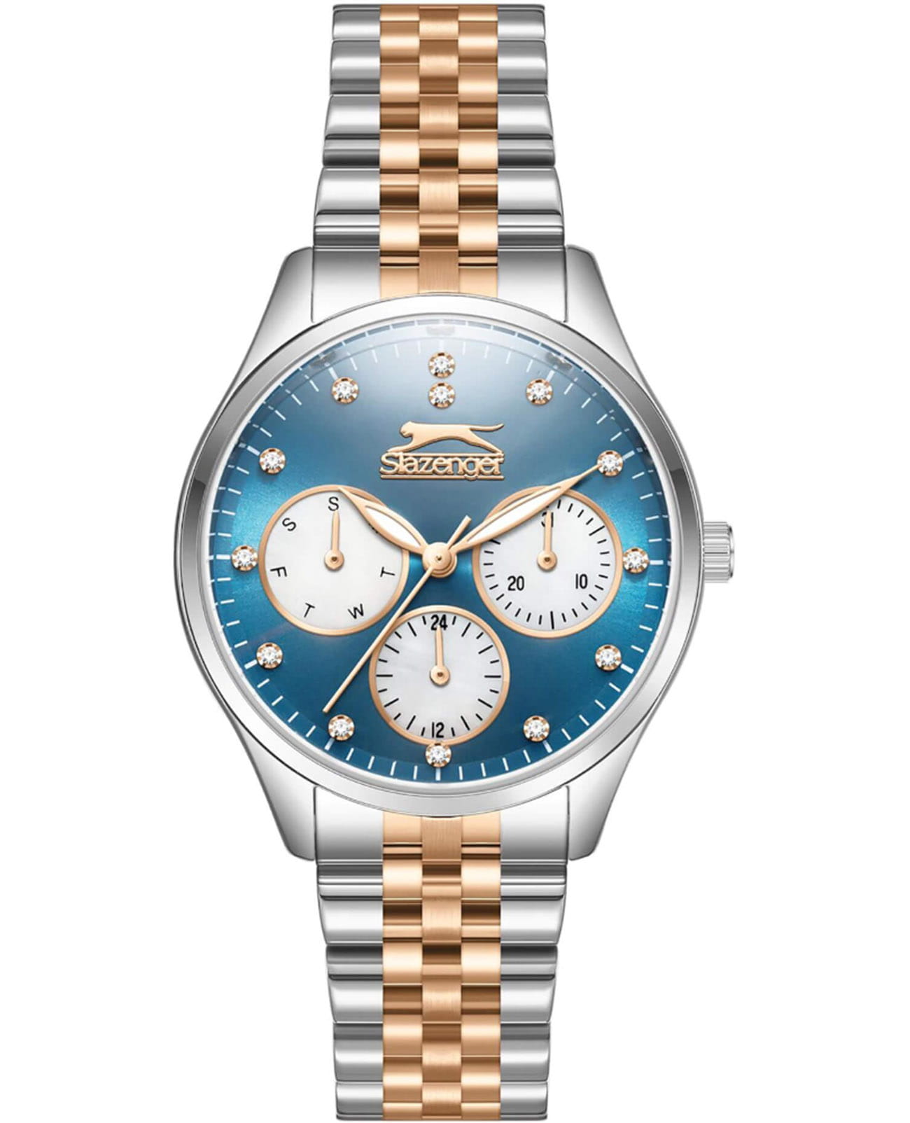 Женские кварцевые часы Slazenger — это элегантный и функциональный аксессуар. Корпус диаметром 34 мм и толщиной 11 мм выполнен из суперметалла. Циферблат синего цвета оформлен индексами и стрелками, украшен фианитами. Циферблат защищён минеральным стекломМинеральное стеклоМинеральное стекло представляет собой искусственно выращенный минерал кварца. Такое стекло отличается особой устойчивостью к повреждениям и царапинам. Уступает по некоторым качествам сапфировому стеклу.. Механизм — кварцевый. Часы оснащены индикацией дня недели, даты и 12/24-часового формата времени. Часы оснащены браслетом из суперметалла с IP-покрытиемIP-покрытиеМетод ионного напыления. Демонстрирует повышенную устойчивость к истиранию, окислению и химическим веществам. Под воздействием высокого давления и температуры около 1500°C молекулы металла надёжно соединяются с частицами корпуса часов. и раскладной застёжкойРаскладная застёжкаТакой тип застёжки используется только на браслетах из металла. Она никогда не раскрывается полностью, происходит разделение на 2 и более частей. Раскладывающая застёжка снизит вероятность потери часов к минимуму.. Водонепроницаемость 50 м позволяет использовать часы в повседневных условиях. Гарантия — 12 месяцев. Идеальный выбор для тех, кто ценит стиль, функциональность и качество.