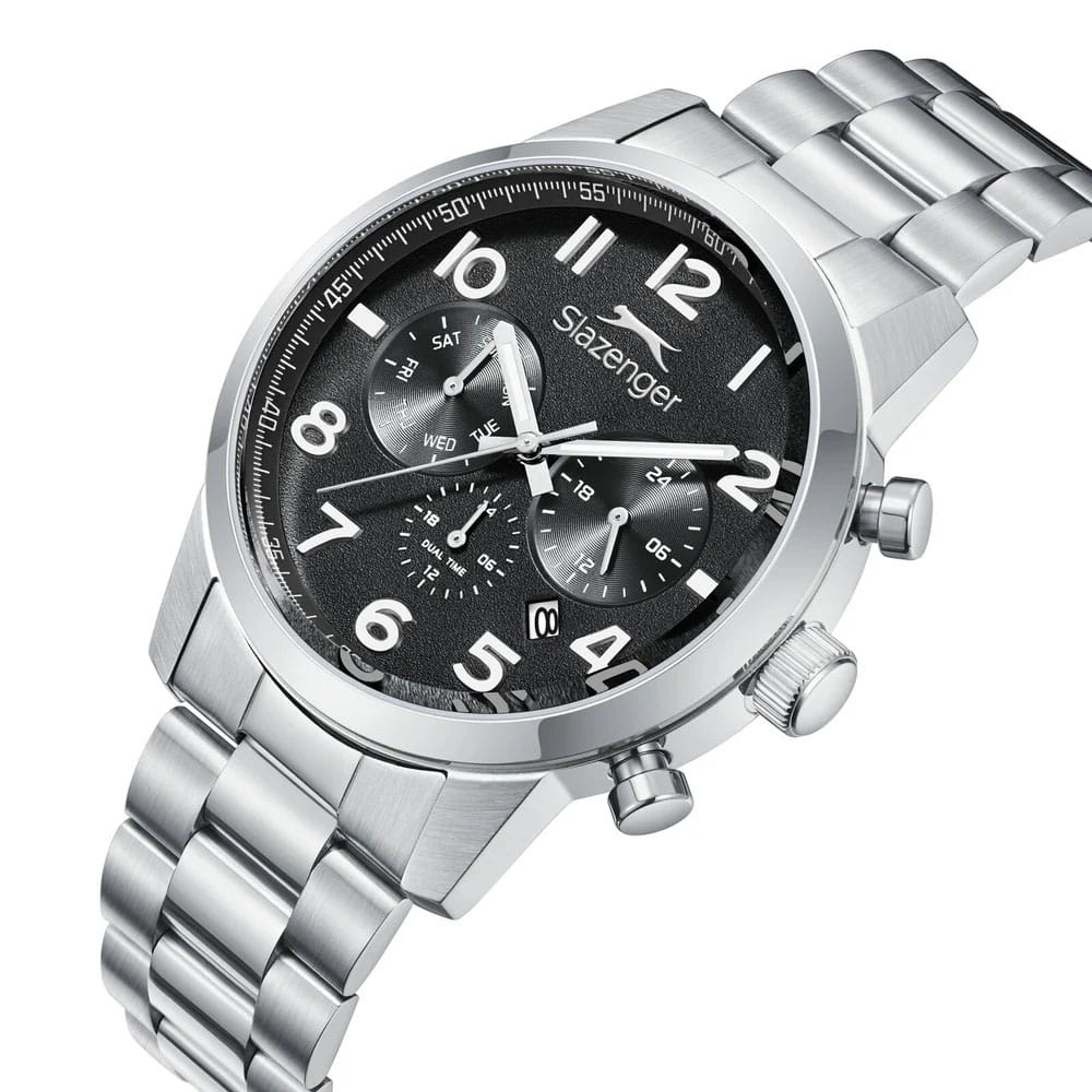 Мужские кварцевые часы Slazenger — это выразительный и функциональный аксессуар. Корпус диаметром 42 мм и толщиной 12 мм выполнен из нержавеющей стали 316L. Циферблат чёрного цвета оформлен индексами и стрелками. Окошко даты расположено на отметке в 6 часов. Указатель дня недели и 24-часовой формат времени вынесены на отдельные субциферблаты. Циферблат защищён минеральным стекломМинеральное стеклоМинеральное стекло представляет собой искусственно выращенный минерал кварца. Такое стекло отличается особой устойчивостью к повреждениям и царапинам. Уступает по некоторым качествам сапфировому стеклу.. Механизм — кварцевый калибр JP25. Часы оснащены функцией второго часового пояса (GMT)Второй часовой поясФункция, позволяющая отображать время двух часовых поясов одновременно.. Стрелки и метки с люминесцентным покрытиемЛюминесцентное покрытиеПозволяет считывать показания времени в темноте. Производители наносят на стрелки, часовые индексы, безель или поверхность циферблата светонакопительный состав, дающий холодное свечение., обеспечивающим хорошую читаемость в темноте. Часы оснащены стальным браслетом с раскладной застёжкойРаскладная застёжкаТакой тип застёжки используется только на браслетах из металла. Она никогда не раскрывается полностью, происходит разделение на 2 и более частей. Раскладывающая застёжка снизит вероятность потери часов к минимуму.. Водонепроницаемость 100 м позволяет использовать часы для плавания и повседневного ношения. Гарантия — 12 месяцев. Идеальный выбор для тех, кто ценит стиль, функциональность и качество.