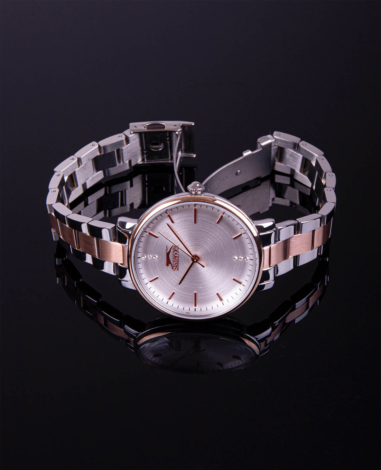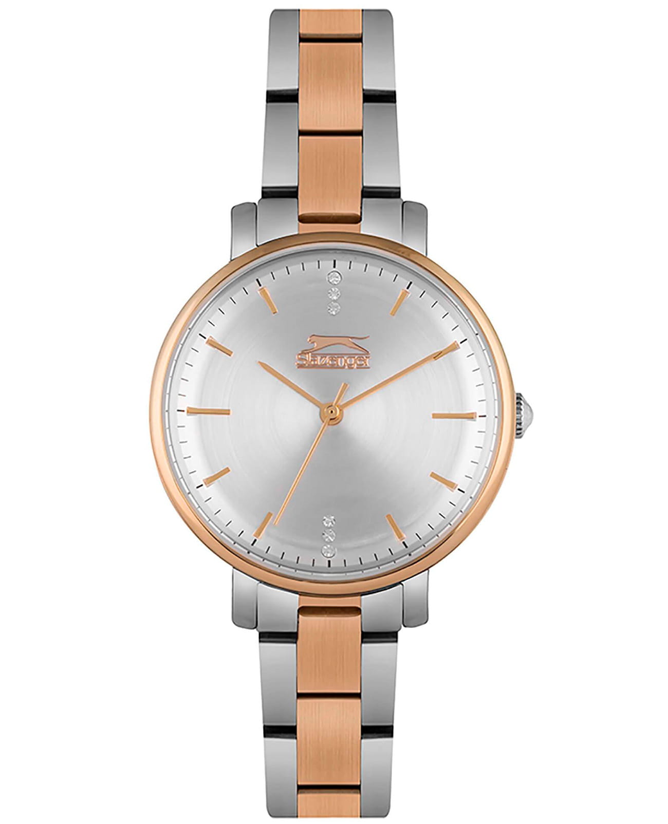 Женские кварцевые часы Slazenger — элегантный аксессуар с гармоничным дизайном и продуманной конструкцией. Корпус диаметром 35 мм и толщиной 8,5 мм выполнен из суперметалла. БезельБезельВнешний ободок, закрепляющий стекло. В спортивных часах так называется поворотное кольцо с делениями на циферблате, выполняет роль таймера – замеряет отрезки времени на шкале. Неподвижный безель – элемент декора. Однонаправленно вращающийся безель на дайверских часах позволяет фиксировать моменты погружения и выныривания на поверхность. с IP-покрытиемIP-покрытиеМетод ионного напыления. Демонстрирует повышенную устойчивость к истиранию, окислению и химическим веществам. Под воздействием высокого давления и температуры около 1500°C молекулы металла надёжно соединяются с частицами корпуса часов.. Циферблат серебристого цвета оформлен индексами и стрелками. Циферблат защищён минеральным стекломМинеральное стеклоМинеральное стекло представляет собой искусственно выращенный минерал кварца. Такое стекло отличается особой устойчивостью к повреждениям и царапинам. Уступает по некоторым качествам сапфировому стеклу.. Механизм — кварцевый калибр Miyota 2035. Браслет из суперметалла с IP-покрытиемIP-покрытиеМетод ионного напыления. Демонстрирует повышенную устойчивость к истиранию, окислению и химическим веществам. Под воздействием высокого давления и температуры около 1500°C молекулы металла надёжно соединяются с частицами корпуса часов.., обеспечивает цельный и утончённый образ. Часы оснащены раскладной застёжкойРаскладная застёжкаТакой тип застёжки используется только на браслетах из металла. Она никогда не раскрывается полностью, происходит разделение на 2 и более частей. Раскладывающая застёжка снизит вероятность потери часов к минимуму.. Водонепроницаемость 30 м позволяет использовать часы в повседневных условиях. Стильное решение для тех, кто ценит лаконичность и качество.