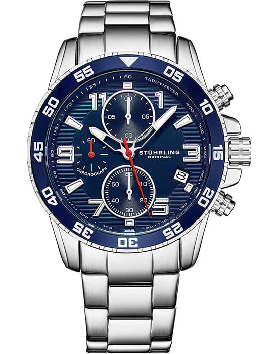 Stuhrling 3957.2 — мощные мужские часы с выразительным спортивным характером и динамичным дизайном. Корпус из нержавеющей стали гармонично сочетается с циферблатом, оформленным рельефным узором и контрастными счётчиками хронографаХронографФункция позволяет измерять отрезки времени с особой точностью: часы, минуты, секунды. Верным признаком хронографа является наличие на циферблате 3 дополнительных окошек-счётчиков.. Широкий безельБезельВнешний ободок, закрепляющий стекло. В спортивных часах так называется поворотное кольцо с делениями на циферблате, выполняет роль таймера – замеряет отрезки времени на шкале. Неподвижный безель – элемент декора. Однонаправленно вращающийся безель на дайверских часах позволяет фиксировать моменты погружения и выныривания на поверхность. с PVD-покрытиемPVDУльтратонкое покрытие наносится в технике вакуумного напыления, сочетает в себе нитрид титана особой прочности со слоем золота или оксида хрома. Несёт в себе декоративную или защитную функцию. подчёркивает брутальный стиль модели, а стрелки и метки с люминесцентным покрытиемЛюминесцентное покрытиеПозволяет считывать показания времени в темноте. Производители наносят на стрелки, часовые индексы, безель или поверхность циферблата светонакопительный состав, дающий холодное свечение. обеспечивают идеальную читаемость в любых условиях. Прочное стекло KrysternaKrysternaKrysterna — инновационное стекло для наручных часов. Благодаря уникальной структуре, Krysterna объединяет ключевые преимущества двух материалов: твердость сапфира, защищающую от царапин, и гибкость минерального стекла, обеспечивающую устойчивость к деформациям. Такая комбинация делает его идеальным решением для часов, подверженных экстремальным нагрузкам, сохраняя при этом оптическую прозрачность. устойчиво к царапинам, сохраняя прозрачность и блеск. Завершает образ стальной браслет с раскладной застёжкойРаскладная застёжкаТакой тип застёжки используется только на браслетах из металла. Она никогда не раскрывается полностью, происходит разделение на 2 и более частей. Раскладывающая застёжка снизит вероятность потери часов к минимуму., гарантирующий комфорт и надёжную фиксацию. Stuhrling — стильная и функциональная модель для уверенных мужчин, ценящих точность и энергию в каждой детали.