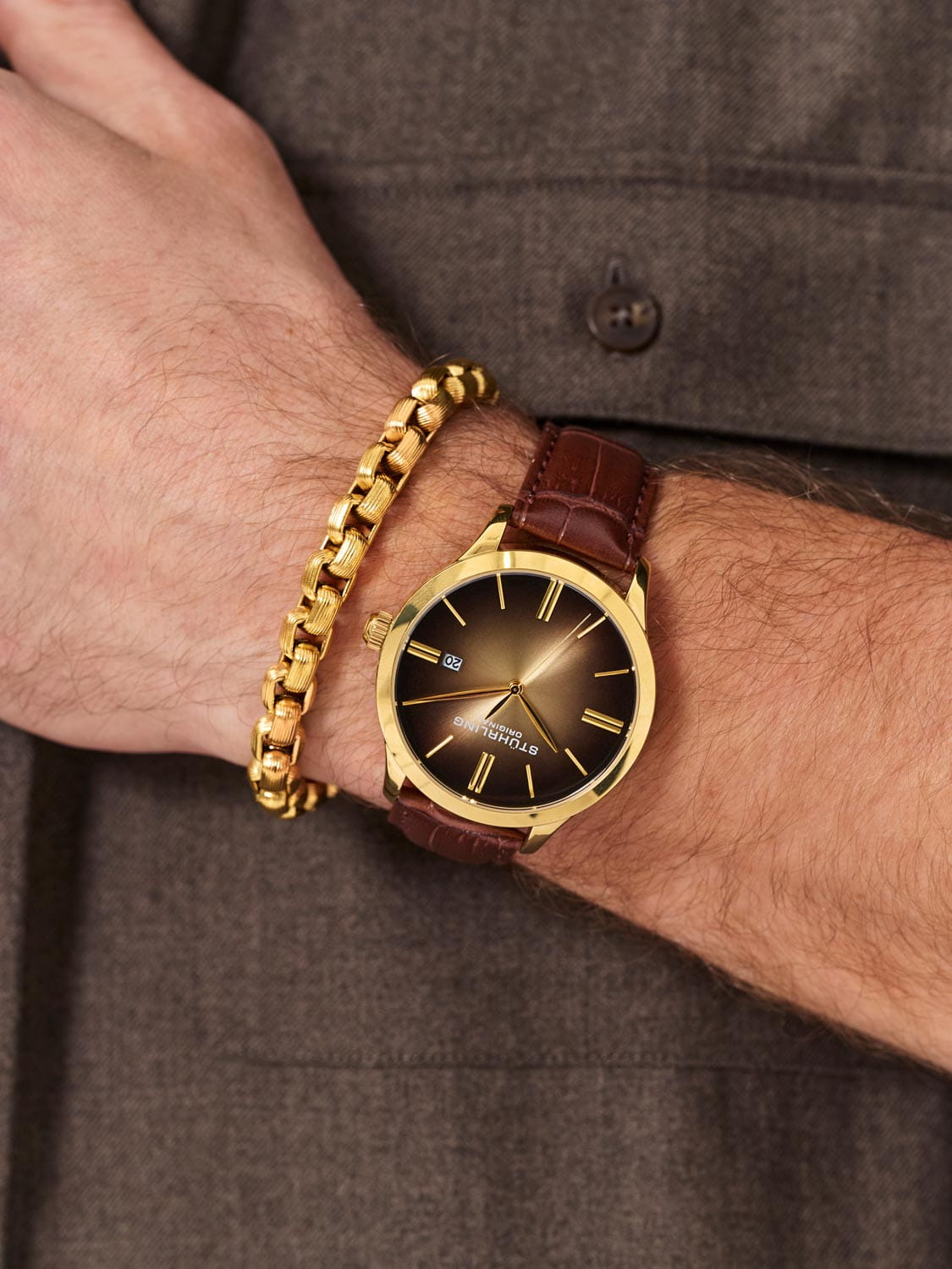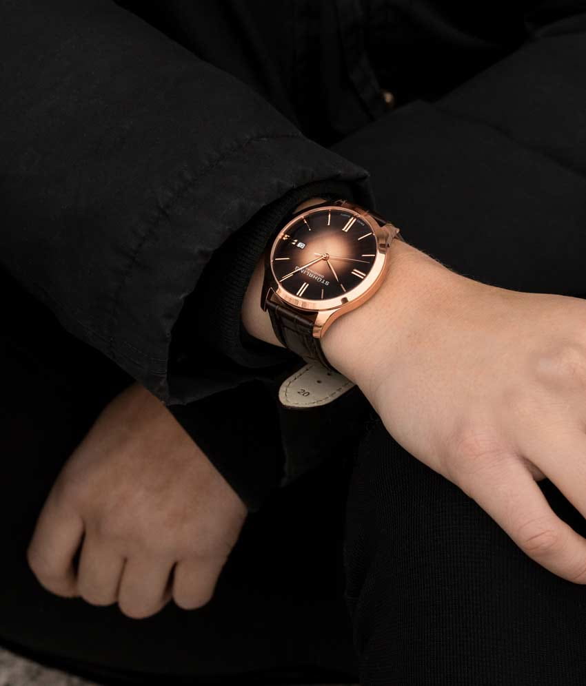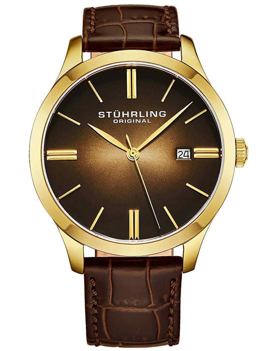 Stuhrling 4014.2 — элегантные мужские часы, объединяющие строгую классику и современную функциональность. Корпус из нержавеющей стали с PVD-покрытиемPVDУльтратонкое покрытие наносится в технике вакуумного напыления, сочетает в себе нитрид титана особой прочности со слоем золота или оксида хрома. Несёт в себе декоративную или защитную функцию. создают ощущение монолитной надёжности, а глубокий циферблат с вертикальной текстурой придаёт модели выразительность и характер. Кожаный ремешок на стандартной застежке обеспечивает комфорт. Крупные метки и стрелки обеспечивают идеальную читаемость. На позиции «3 часов» расположено аккуратное окно даты, подчёркивающее симметрию дизайна. Прочное стекло Krysterna защищает циферблат от царапин, а надёжный кварцевый механизм гарантирует стабильную точность. Stuhrling — выбор уверенного мужчины, ценящего сочетание функциональности, лаконичного дизайна и безупречной отделки.
