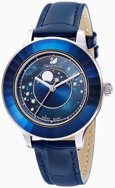 Женские часы Swarovski Octea Lux 5516305 – это специальный выпуск популярных часов Octea Lux приурочен к 50-летию первой высадки человека на Луну. Это первые часы Swarovski с полностью функциональным циферблатом, показывающим фазы Луны. Целая галактика прозрачных кристаллов сияет на фоне синего перламутрового циферблата. Он элегантно сочетается с кристальным безелемБезельВнешний ободок, закрепляющий стекло. В спортивных часах так называется поворотное кольцо с делениями на циферблате, выполняет роль таймера – замеряет отрезки времени на шкале. Неподвижный безель – элемент декора. Однонаправленно вращающийся безель на дайверских часах позволяет фиксировать моменты погружения и выныривания на поверхность. тёмного оттенка индиго с PVDPVDУльтратонкое покрытие наносится в технике вакуумного напыления, сочетает в себе нитрид титана особой прочности со слоем золота или оксида хрома. Несёт в себе декоративную или защитную функцию. покрытием и синим ремешком из натуральной кожи с тиснением под крокодила. Надежное минеральное стеклоМинеральное стеклоМинеральное стекло представляет собой искусственно выращенный минерал кварца. Такое стекло отличается особой устойчивостью к повреждениям и царапинам. Уступает по некоторым качествам сапфировому стеклу. защищает часы от царапин и долго сохраняет первоначальный внешний вид.  Эти современные утончённые часы преобразят любой повседневный образ.