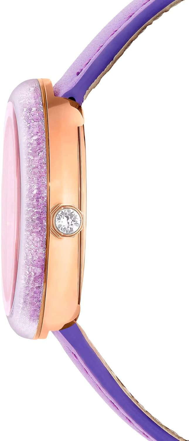 Элегантные швейцарские часы Swarovski 5656896 станут идеальным аксессуаром для тех, кто ценит стиль и изысканность. Эти часы оснащены кварцевым механизмом, что гарантирует точность и надежность в повседневной жизни. Корпус из стали PVDPVDУльтратонкое покрытие наносится в технике вакуумного напыления, сочетает в себе нитрид титана особой прочности со слоем золота или оксида хрома. Несёт в себе декоративную или защитную функцию. покрытием оттенка розового золота имеет классическую круглую форму, а розово-фиолетовый циферблат, лишенный меток, создает смелый и дерзкий образ. Особое внимание привлекают 3460 кристаллов Swarovski розового и фиолетового цвета, которые украшают циферблат, корпус и безельБезельВнешний ободок, закрепляющий стекло. В спортивных часах так называется поворотное кольцо с делениями на циферблате, выполняет роль таймера – замеряет отрезки времени на шкале. Неподвижный безель – элемент декора. Однонаправленно вращающийся безель на дайверских часах позволяет фиксировать моменты погружения и выныривания на поверхность., создавая ослепительный блеск. В положении 12 часов расположился культовый логотип Swarovski в виде лебедя, подчеркивающий уникальность дизайна. Мечевидные стрелки в стиле Sword добавляют элегантности, а граненая заводная головка с кристаллом круглой огранки завершает образ. Ремешок из натуральной итальянской телячьей кожи ярко-фиолетового цвета обеспечивает комфортное ношение и дополняет общий стиль часов. Классическая застежка с логотипом Swarovski гарантирует надежную фиксацию. Сапфировое стеклоСапфировое стеклоПрочный и надёжный материал из кристалла сапфира синтетического происхождения, характеризующийся особой твёрдостью и устойчивостью к царапинам и повреждениям. защищает часы от царапин и других повреждений, а водозащита 50WR позволяет не беспокоиться о случайных попаданиях воды. Диаметр корпуса составляет 33 мм, а длина ремешка — 16,5 см, что делает их идеальными для изящного запястья.