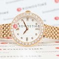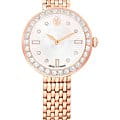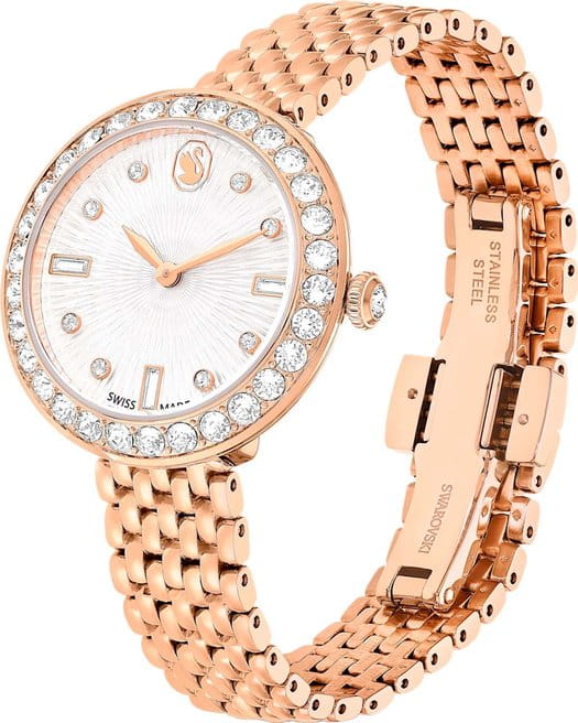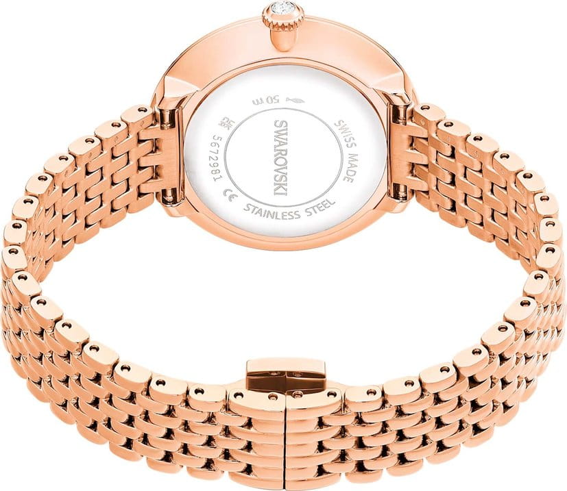 Часы Swarovski 5672981 – это воплощение изысканного дизайна и функциональности, созданное для тех, кто ценит красоту и точность. Стальной круглый корпус имеет красивую отделку PVDPVDУльтратонкое покрытие наносится в технике вакуумного напыления, сочетает в себе нитрид титана особой прочности со слоем золота или оксида хрома. Несёт в себе декоративную или защитную функцию. покрытием оттенка розового золота и оснащен безелемБезельВнешний ободок, закрепляющий стекло. В спортивных часах так называется поворотное кольцо с делениями на циферблате, выполняет роль таймера – замеряет отрезки времени на шкале. Неподвижный безель – элемент декора. Однонаправленно вращающийся безель на дайверских часах позволяет фиксировать моменты погружения и выныривания на поверхность., украшенным паве из тридцати мерцающих кристаллов. Под минеральным стекломМинеральное стеклоМинеральное стекло представляет собой искусственно выращенный минерал кварца. Такое стекло отличается особой устойчивостью к повреждениям и царапинам. Уступает по некоторым качествам сапфировому стеклу. открывается белый циферблат дополненный логотипом Swarovski в виде лебедя на 12 часах и кристаллами на отметках 3, 6 и 9 часов. Отсутствие секундной стрелки подчеркивает минимализм и утонченность дизайна. Рифленая заводная головка также украшена сверкающим кристаллом круглой огранки. Стальной браслет с отделкой PVDPVDУльтратонкое покрытие наносится в технике вакуумного напыления, сочетает в себе нитрид титана особой прочности со слоем золота или оксида хрома. Несёт в себе декоративную или защитную функцию. покрытием цвета розового золота и застежкой «бабочка»Застёжка "бабочка"Такой вид застёжки дополняется предохранителями, помогающими избежать случайного раскрытия браслета. Обладают изящным исполнением. . Водозащита 50WR делает их устойчивыми к влаге, позволяя наслаждаться стильным аксессуаром в любых условиях.