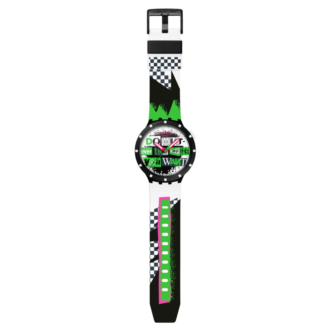 Мужские наручные часы Swatch LASH OUT SB03B701 — это стильный и современный аксессуар для тех, кто ценит лёгкость и комфорт. На крупном белом циферблате этих часов размещен броский цветной принт с надписью: «Do whatever the … you want» («Делай что... хочешь»), в которую специальное окошко календаря подставляет на место пропуска слово, меняющееся раз в две недели. Корпус и безельБезельВнешний ободок, закрепляющий стекло. В спортивных часах так называется поворотное кольцо с делениями на циферблате, выполняет роль таймера – замеряет отрезки времени на шкале. Неподвижный безель – элемент декора. Однонаправленно вращающийся безель на дайверских часах позволяет фиксировать моменты погружения и выныривания на поверхность. выполнены из биокерамики, диаметром 47 мм и толщиной 11.75 мм, что обеспечивает долговечность и утончённый внешний вид. Циферблат защищён органическим стеклом, устойчивым к повреждениям. Модель оснащена кварцевым механизмом, обеспечивающим высокую точность хода. Стрелки с люминесцентным покрытиемЛюминесцентное покрытиеПозволяет считывать показания времени в темноте. Производители наносят на стрелки, часовые индексы, безель или поверхность циферблата светонакопительный состав, дающий холодное свечение.. Силиконовый ремешок на стандартной застёжке гармонично дополняет корпус и обеспечивает комфортное ношение. Водозащита 30 метров позволит защитить корпус от случайных брызг или капель дождя. Эти часы подойдут для повседневного ношения и станут ярким акцентом в вашем наряде.
