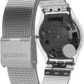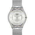 Швейцарские наручные часы Swatch SFM118M. Эти современные и легкие женские часы относятся к коллекции Skin, изготовлены из сверхтонкого и точного кварца швейцарского производства. Ультратонкие, толщина 3.9 мм, диаметр корпуса 34 мм. С водозащитой до 30 метров они надежно защищают корпус от случайных брызг и капель дождя. Многослойное акриловое стекло, используемое в этих часах, обладает высокой прочностью и трудно разбивается; это легкий прозрачный пластик, который может прогибаться при ударах и не разлетается на осколки. Кроме того, акрил устойчив к перепадам температуры и высокому давлению. Корпус часов выполнен из полимера, а механизм — кварцевый. Кварцевые часы обеспечивают большую точность по сравнению с механическими, с погрешностью хода около 20 секунд в месяц. Они не требуют завода, достаточно менять батарейку раз в несколько лет. Стальной браслет миланского плетения на застежке "раскладной замок", позволяющей легко регулировать браслет по длине.