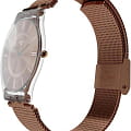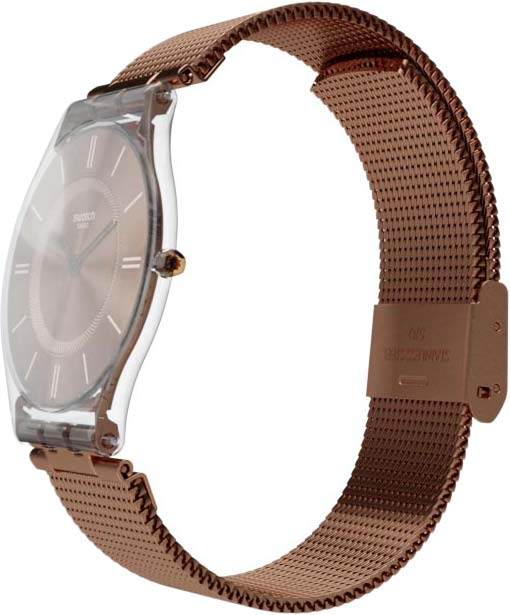 Швейцарские наручные часы Swatch SFP115M. Эти современные и легкие женские часы относятся к коллекции Skin, изготовлены из сверхтонкого и точного кварца швейцарского производства. Ультратонкие, толщина 3.9 мм, диаметр корпуса 34 мм. С водозащитой до 30 метров они надежно защищают корпус от случайных брызг и капель дождя. Многослойное акриловое стекло, используемое в этих часах, обладает высокой прочностью и трудно разбивается; это легкий прозрачный пластик, который может прогибаться при ударах и не разлетается на осколки. Кроме того, акрил устойчив к перепадам температуры и высокому давлению. Корпус часов выполнен из полимера, а механизм — кварцевый. Кварцевые часы обеспечивают большую точность по сравнению с механическими, с погрешностью хода около 20 секунд в месяц. Они не требуют завода, достаточно менять батарейку раз в несколько лет. Стальной браслет с PVD-покрытиемPVDУльтратонкое покрытие наносится в технике вакуумного напыления, сочетает в себе нитрид титана особой прочности со слоем золота или оксида хрома. Несёт в себе декоративную или защитную функцию. миланского плетения на застежке "раскладной замок", позволяющей легко регулировать браслет по длине.