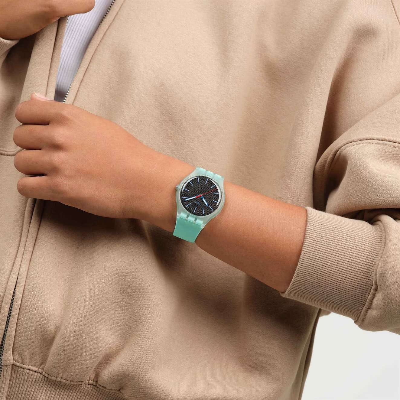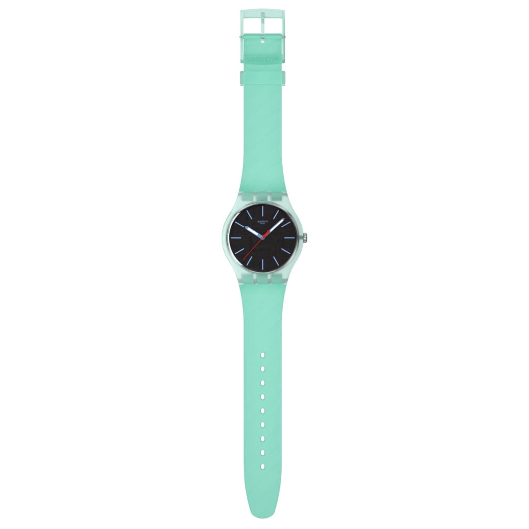 Мужские наручные часы Swatch HINT OF MINT SO29L103 — это стильный и современный аксессуар для тех, кто ценит лёгкость и комфорт. Корпус выполнен из пластика, диаметром 41 мм и толщиной 9.85 мм, что обеспечивает долговечность и утончённый внешний вид. Циферблат защищён органическим стеклом, устойчивым к повреждениям. Модель оснащена кварцевым механизмом, обеспечивающим высокую точность хода. Часовая и минутная стрелки с люминесцентным покрытиемЛюминесцентное покрытиеПозволяет считывать показания времени в темноте. Производители наносят на стрелки, часовые индексы, безель или поверхность циферблата светонакопительный состав, дающий холодное свечение.. Силиконовый текстурированный матово-бирюзовый ремешок на стандартной застёжке гармонично дополняет корпус и обеспечивает комфортное ношение. Водозащита 30 метров позволит защитить корпус от случайных брызг или капель дождя. Эти часы подойдут для повседневного ношения и станут ярким акцентом в вашем наряде.