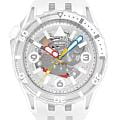 Мужские дайверские часы Swatch AURELIA AURITA SSCU09K100 — это стильный и современный аксессуар для тех, кто ценит лёгкость и комфорт. Корпус выполнен из биокерамики, который состоит из матовых и блестящих прозрачных частей из биоматериала, диаметром 44 мм и толщиной 15.4 мм, что обеспечивает долговечность и утончённый внешний вид. Циферблат защищён органическим стеклом, устойчивым к повреждениям. Модель оснащена кварцевым механизмом, обеспечивающим высокую точность хода. БезельБезельВнешний ободок, закрепляющий стекло. В спортивных часах так называется поворотное кольцо с делениями на циферблате, выполняет роль таймера – замеряет отрезки времени на шкале. Неподвижный безель – элемент декора. Однонаправленно вращающийся безель на дайверских часах позволяет фиксировать моменты погружения и выныривания на поверхность. из белого просвечивающего биоматериала с серо-белым принтом, светящимся в темноте, и белая матовая заводная головка из биокерамики, размещенная в районе отметки 10 часов. Стрелки и метки с люминесцентным покрытиемЛюминесцентное покрытиеПозволяет считывать показания времени в темноте. Производители наносят на стрелки, часовые индексы, безель или поверхность циферблата светонакопительный состав, дающий холодное свечение.. Силиконовый ремешок на стандартной застёжке гармонично дополняет корпус и обеспечивает комфортное ношение. Водозащита 100 метров позволит плавать, нырять и заниматься другими водными видами спорта. Эти часы подойдут для повседневного ношения и станут ярким акцентом в вашем наряде.