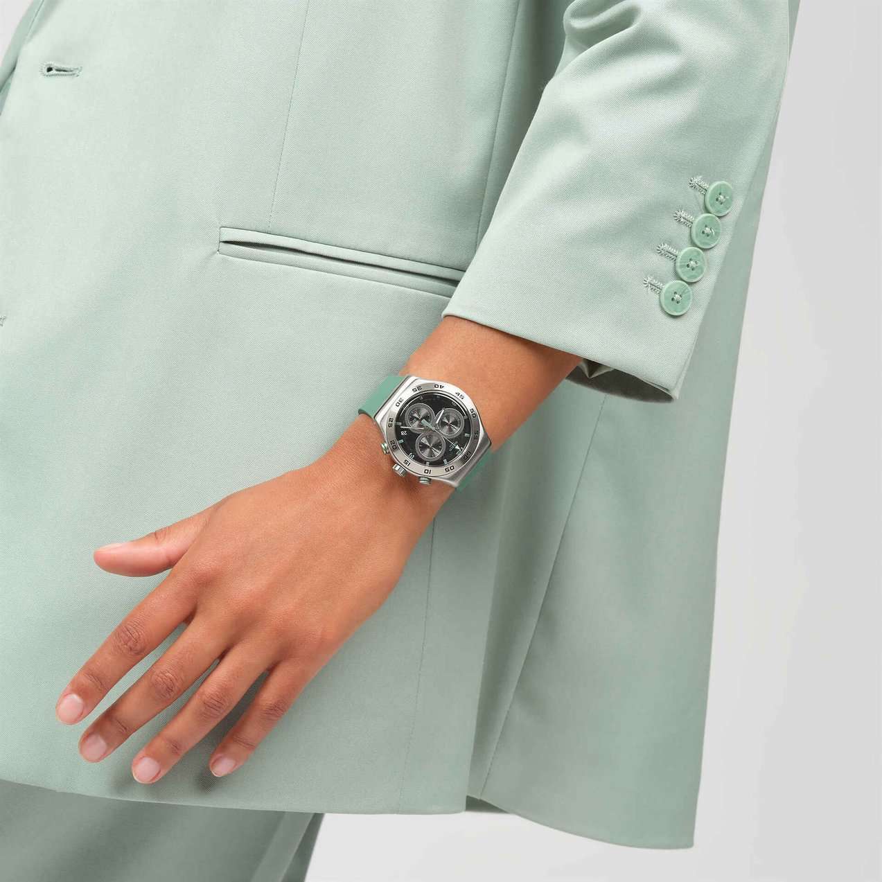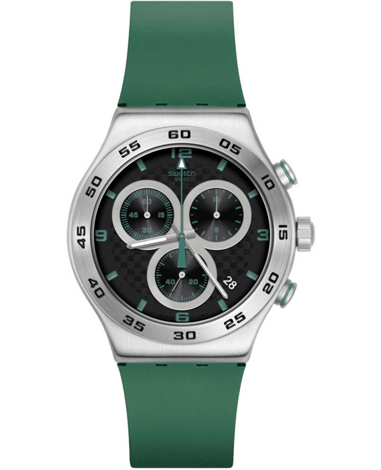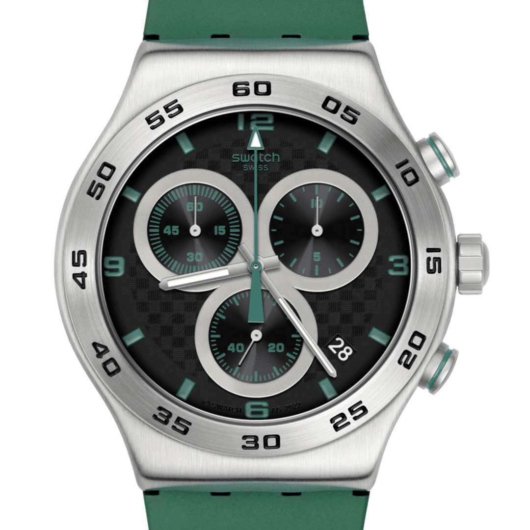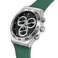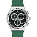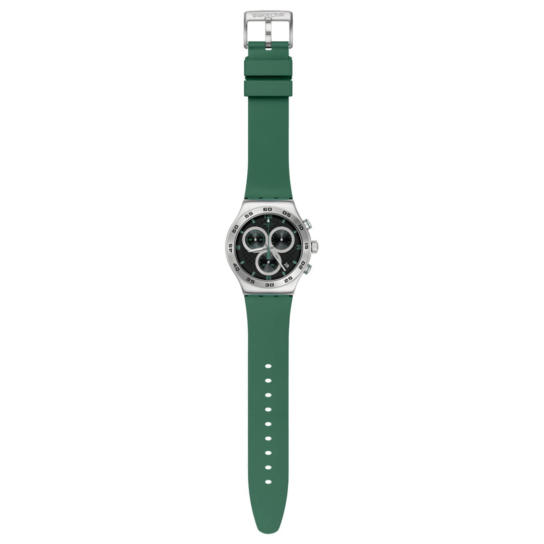 Часы Swatch YVS525 — это стильный и современный аксессуар для тех, кто ценит лёгкость и комфорт. Эти часы с хронографомХронографФункция позволяет измерять отрезки времени с особой точностью: часы, минуты, секунды. Верным признаком хронографа является наличие на циферблате 3 дополнительных окошек-счётчиков. из нержавеющей стали воплощают в себе утонченный стиль городского шика. Черный циферблат сочетает в себе уникальный эффект углеродного волокна и красный принт. Матированный корпус из нержавеющей стали и пряжка в сочетании с матово-зеленым каучуковым ремешком и тренчиком производят неизгладимое впечатление. На часовую, минутную и секундную стрелки нанесено люминесцентное покрытиеЛюминесцентное покрытиеПозволяет считывать показания времени в темноте. Производители наносят на стрелки, часовые индексы, безель или поверхность циферблата светонакопительный состав, дающий холодное свечение., которое светится в темноте, создавая необычное изображение. Водозащита 30 метров делает часы практичными для повседневного использования. Эти часы подойдут для повседневного ношения и станут ярким акцентом в вашем наряде.