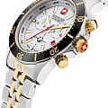 Мужские швейцарские часы-хронографХронографФункция позволяет измерять отрезки времени с особой точностью: часы, минуты, секунды. Верным признаком хронографа является наличие на циферблате 3 дополнительных окошек-счётчиков. с секундомеромСекундомерСекундоме́р — прибор, способный измерять интервалы времени с точностью до долей секунды. Swiss Military Hanowa Flagship X Chrono SMWGI2100760, кварцевый механизм с высокой точностью. Сапфировое стеклоСапфировое стеклоПрочный и надёжный материал из кристалла сапфира синтетического происхождения, характеризующийся особой твёрдостью и устойчивостью к царапинам и повреждениям. устойчивое к появлению царапин, обладающее высокой прозрачностью. Класс водозащиты: 100 метров, позволит плавать, нырять и заниматься другими водными видами спорта. Корпус часов изготовлен из стали с IP-покрытиемIP-покрытиеМетод ионного напыления. Демонстрирует повышенную устойчивость к истиранию, окислению и химическим веществам. Под воздействием высокого давления и температуры около 1500°C молекулы металла надёжно соединяются с частицами корпуса часов. цвета желтое золото. Неподвижный безельБезельВнешний ободок, закрепляющий стекло. В спортивных часах так называется поворотное кольцо с делениями на циферблате, выполняет роль таймера – замеряет отрезки времени на шкале. Неподвижный безель – элемент декора. Однонаправленно вращающийся безель на дайверских часах позволяет фиксировать моменты погружения и выныривания на поверхность. из нержавеющей стали с IP-покрытиемIP-покрытиеМетод ионного напыления. Демонстрирует повышенную устойчивость к истиранию, окислению и химическим веществам. Под воздействием высокого давления и температуры около 1500°C молекулы металла надёжно соединяются с частицами корпуса часов..