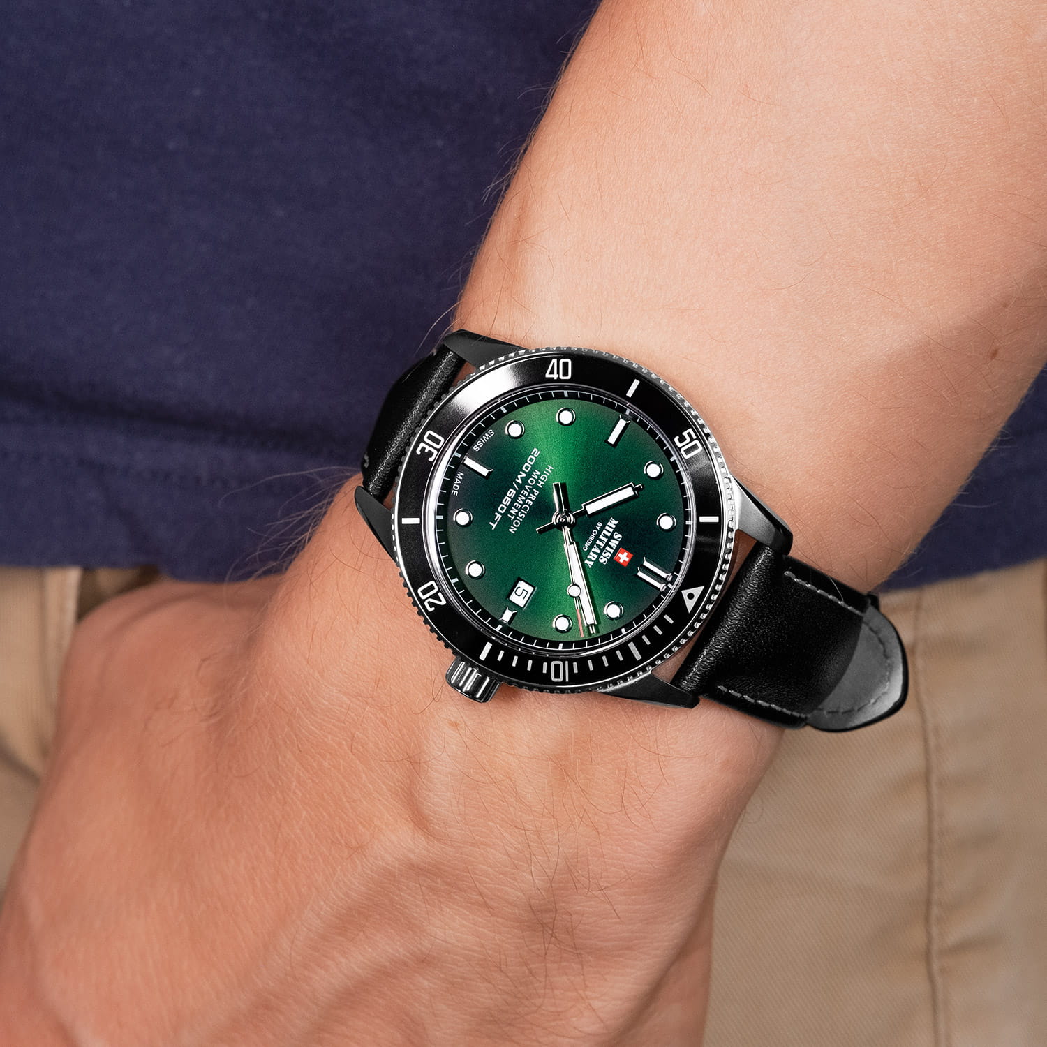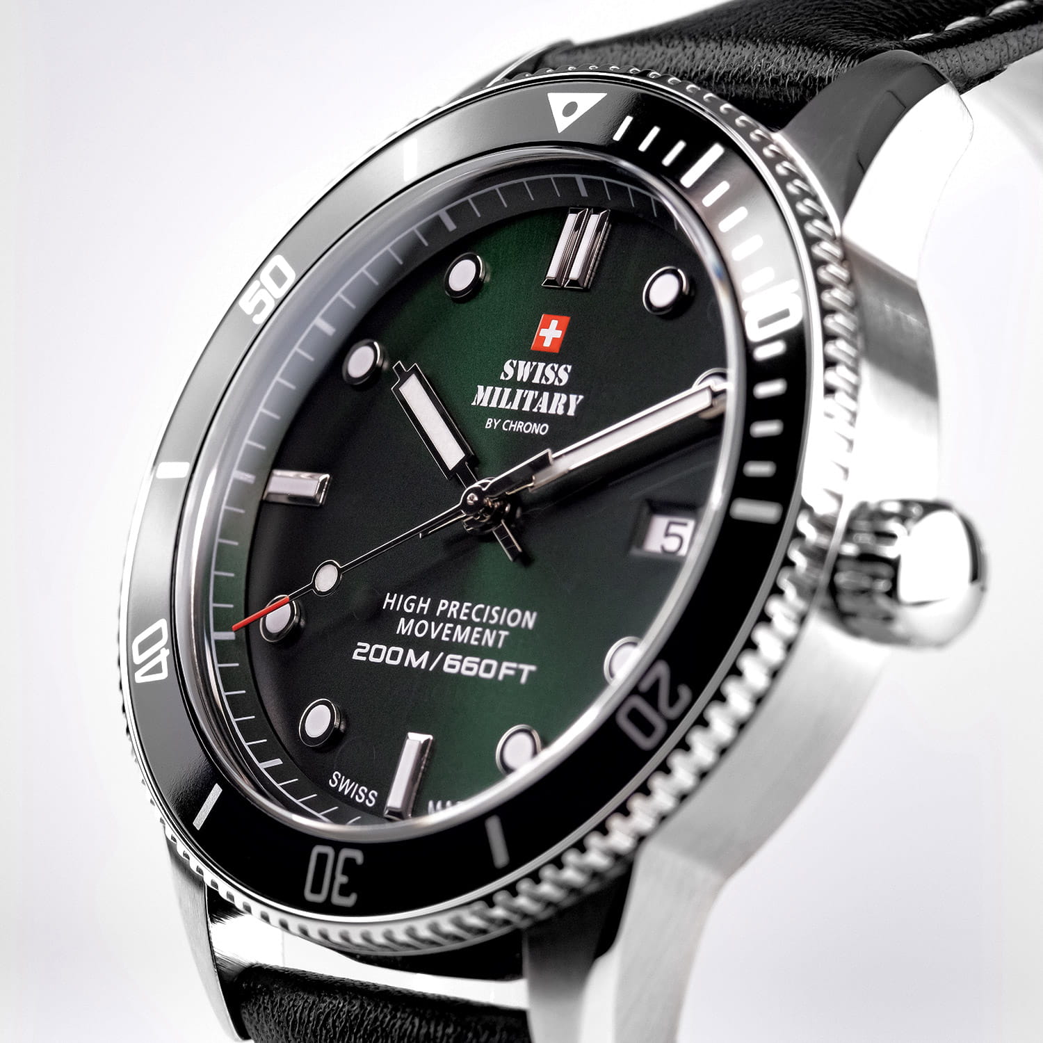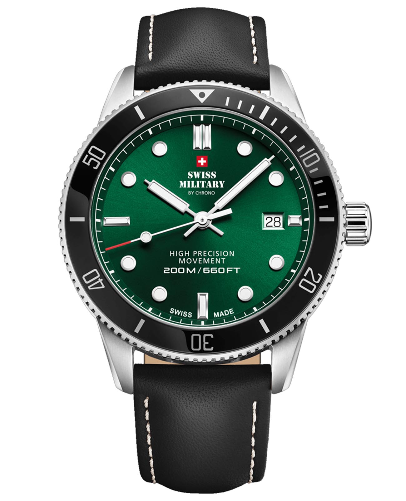 Мужские швейцарские наручные часы Swiss Military by Chrono Сверхточные SM34088.06, кварцевый механизм с высокой точностью. Вращающийся безельБезельВнешний ободок, закрепляющий стекло. В спортивных часах так называется поворотное кольцо с делениями на циферблате, выполняет роль таймера – замеряет отрезки времени на шкале. Неподвижный безель – элемент декора. Однонаправленно вращающийся безель на дайверских часах позволяет фиксировать моменты погружения и выныривания на поверхность.. Минеральное стеклоМинеральное стеклоМинеральное стекло представляет собой искусственно выращенный минерал кварца. Такое стекло отличается особой устойчивостью к повреждениям и царапинам. Уступает по некоторым качествам сапфировому стеклу.. Люминесцентное покрытиеЛюминесцентное покрытиеПозволяет считывать показания времени в темноте. Производители наносят на стрелки, часовые индексы, безель или поверхность циферблата светонакопительный состав, дающий холодное свечение. стрелок и меток. Кожаный ремешок на стандартной застёжке. Окошко даты находится в положении 3 часа. Класс водозащиты: 200 метров, позволит плавать, нырять и заниматься другими водными видами спорта. Корпус часов изготовлен из стали, цвета.