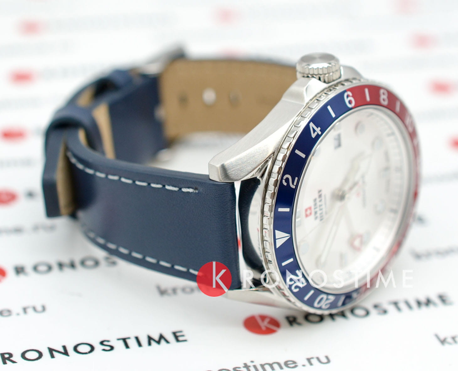 Мужские швейцарские часы Swiss Military by Chrono Quartz GMT SM34095.04, кварцевый механизм с высокой точностью. Cапфировое стеклоСапфировое стеклоПрочный и надёжный материал из кристалла сапфира синтетического происхождения, характеризующийся особой твёрдостью и устойчивостью к царапинам и повреждениям. устойчивое к появлению царапин и обладающее высокой прозрачностью. Корпус часов изготовлен из нержавеющей стали. Вращающийся безельБезельВнешний ободок, закрепляющий стекло. В спортивных часах так называется поворотное кольцо с делениями на циферблате, выполняет роль таймера – замеряет отрезки времени на шкале. Неподвижный безель – элемент декора. Однонаправленно вращающийся безель на дайверских часах позволяет фиксировать моменты погружения и выныривания на поверхность. из нержавеющей стали с PVDPVDУльтратонкое покрытие наносится в технике вакуумного напыления, сочетает в себе нитрид титана особой прочности со слоем золота или оксида хрома. Несёт в себе декоративную или защитную функцию. покрытием. Окошко даты находится в положении 3 часов. Стрелки с люминесцентным покрытиемЛюминесцентное покрытиеПозволяет считывать показания времени в темноте. Производители наносят на стрелки, часовые индексы, безель или поверхность циферблата светонакопительный состав, дающий холодное свечение.. Класс водозащиты: 100 метров, позволит плавать, нырять и заниматься другими водными видами спорта. Кожаный ремешок на стандартной застежке.