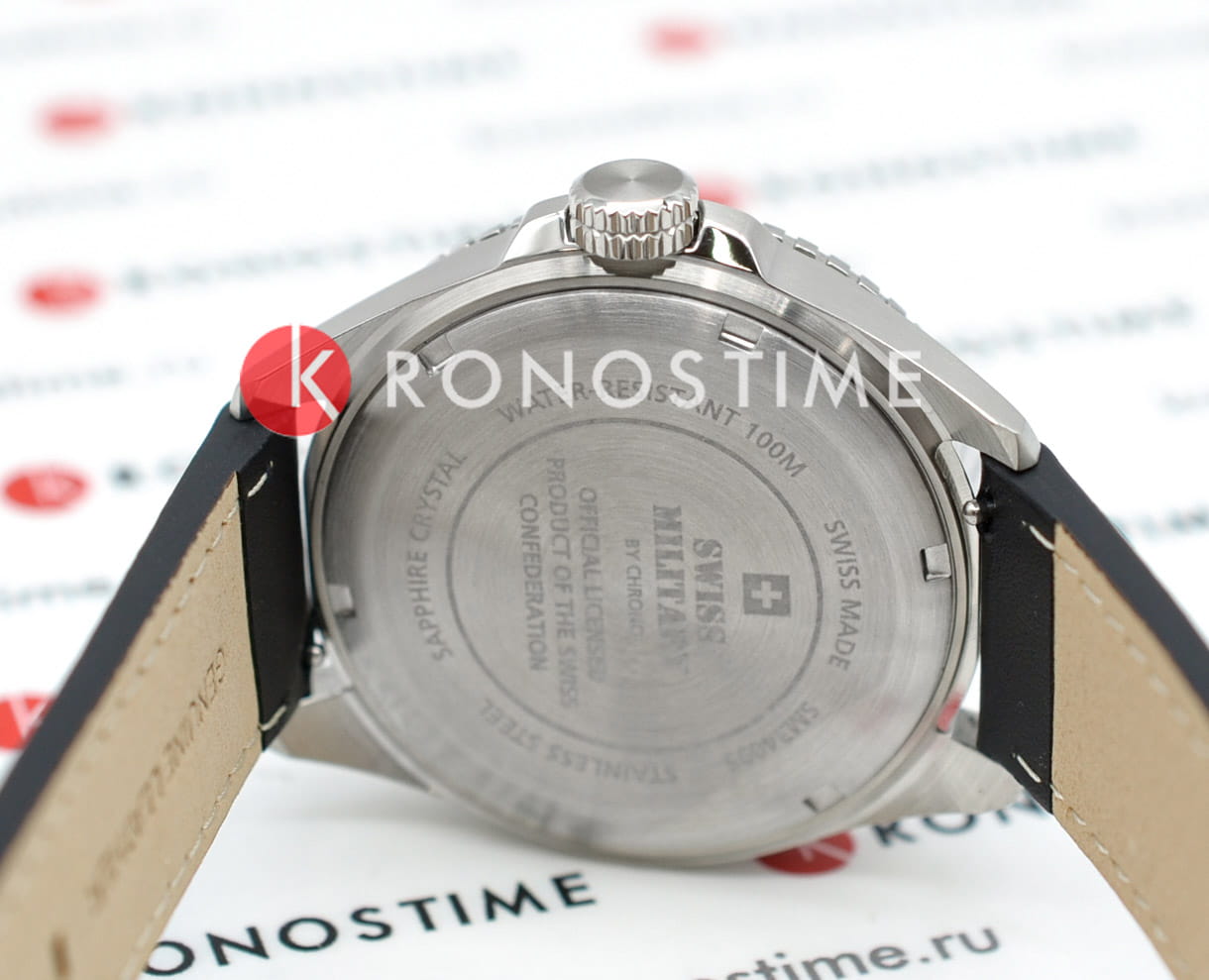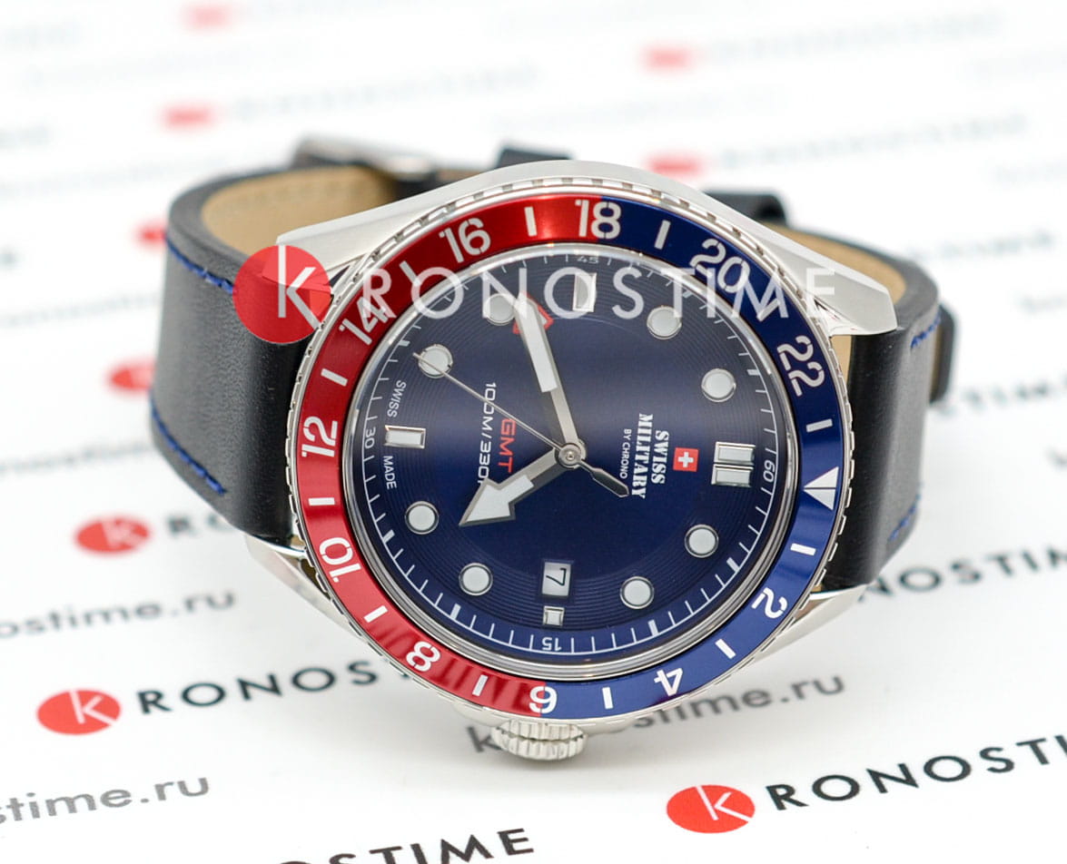 Мужские швейцарские часы Swiss Military by Chrono Quartz GMT SM34095.06, кварцевый механизм с высокой точностью. Cапфировое стеклоСапфировое стеклоПрочный и надёжный материал из кристалла сапфира синтетического происхождения, характеризующийся особой твёрдостью и устойчивостью к царапинам и повреждениям. устойчивое к появлению царапин и обладающее высокой прозрачностью. Корпус часов изготовлен из нержавеющей стали. Вращающийся безельБезельВнешний ободок, закрепляющий стекло. В спортивных часах так называется поворотное кольцо с делениями на циферблате, выполняет роль таймера – замеряет отрезки времени на шкале. Неподвижный безель – элемент декора. Однонаправленно вращающийся безель на дайверских часах позволяет фиксировать моменты погружения и выныривания на поверхность. из нержавеющей стали с PVDPVDУльтратонкое покрытие наносится в технике вакуумного напыления, сочетает в себе нитрид титана особой прочности со слоем золота или оксида хрома. Несёт в себе декоративную или защитную функцию. покрытием. Окошко даты находится в положении 3 часов. Стрелки с люминесцентным покрытиемЛюминесцентное покрытиеПозволяет считывать показания времени в темноте. Производители наносят на стрелки, часовые индексы, безель или поверхность циферблата светонакопительный состав, дающий холодное свечение.. Класс водозащиты: 100 метров, позволит плавать, нырять и заниматься другими водными видами спорта. Кожаный ремешок на стандартной застежке.