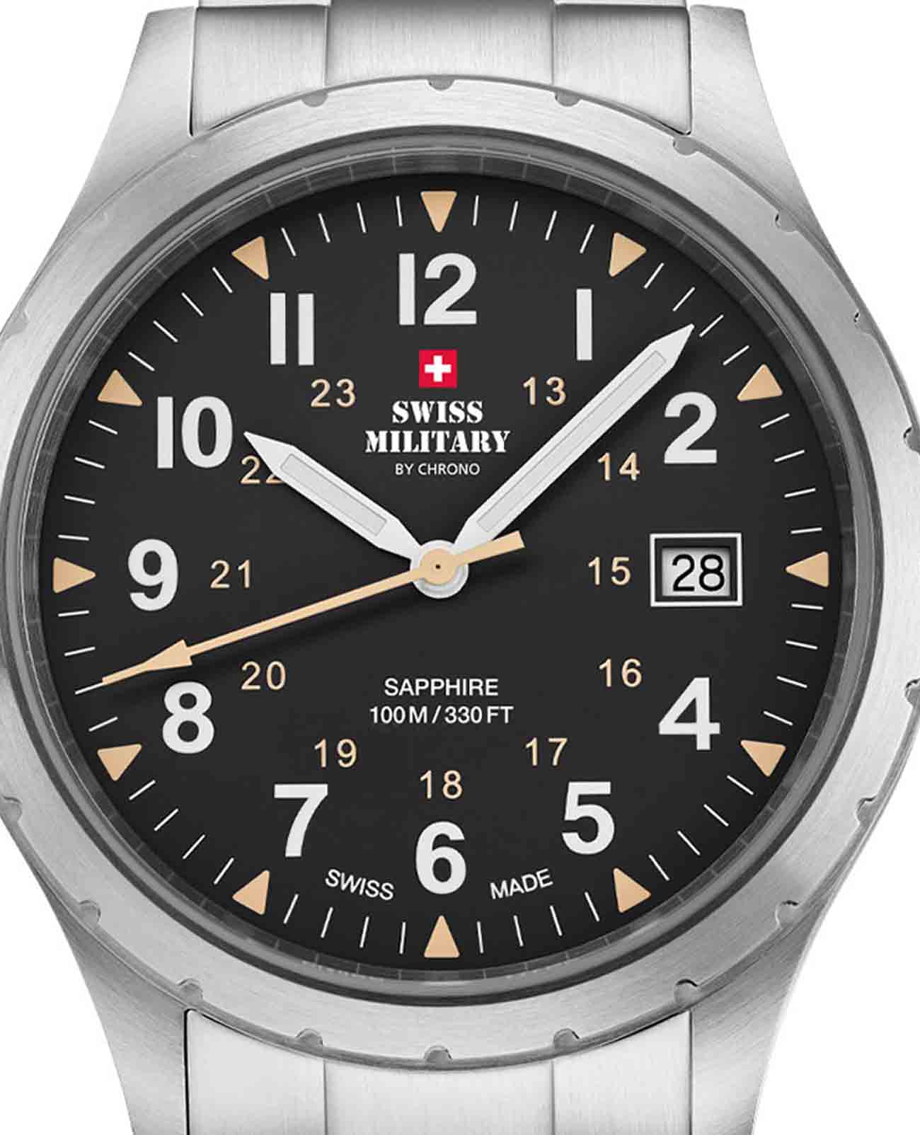 Модель SM34108.01 от Swiss Military by Chrono — это надёжные швейцарские часы в классическом армейском стиле, сочетающие функциональность и сдержанный дизайн. Корпус и браслет выполнены из нержавеющей стали, подчёркивая прочность и элегантность конструкции. Циферблат с арабскими цифрами обеспечивает отличную читаемость, а функция отображения даты добавляет практичности. Часы оснащены кварцевым механизмом, обеспечивающим точный ход. Циферблат защищён сапфировым стекломСапфировое стеклоПрочный и надёжный материал из кристалла сапфира синтетического происхождения, характеризующийся особой твёрдостью и устойчивостью к царапинам и повреждениям., устойчивым к царапинам. Установлена раскладная застёжкаРаскладная застёжкаТакой тип застёжки используется только на браслетах из металла. Она никогда не раскрывается полностью, происходит разделение на 2 и более частей. Раскладывающая застёжка снизит вероятность потери часов к минимуму. для надёжной фиксации на запястье. Модель обладает водонепроницаемостью до 100 метров, что делает её подходящей для плавания и сноркелинга.