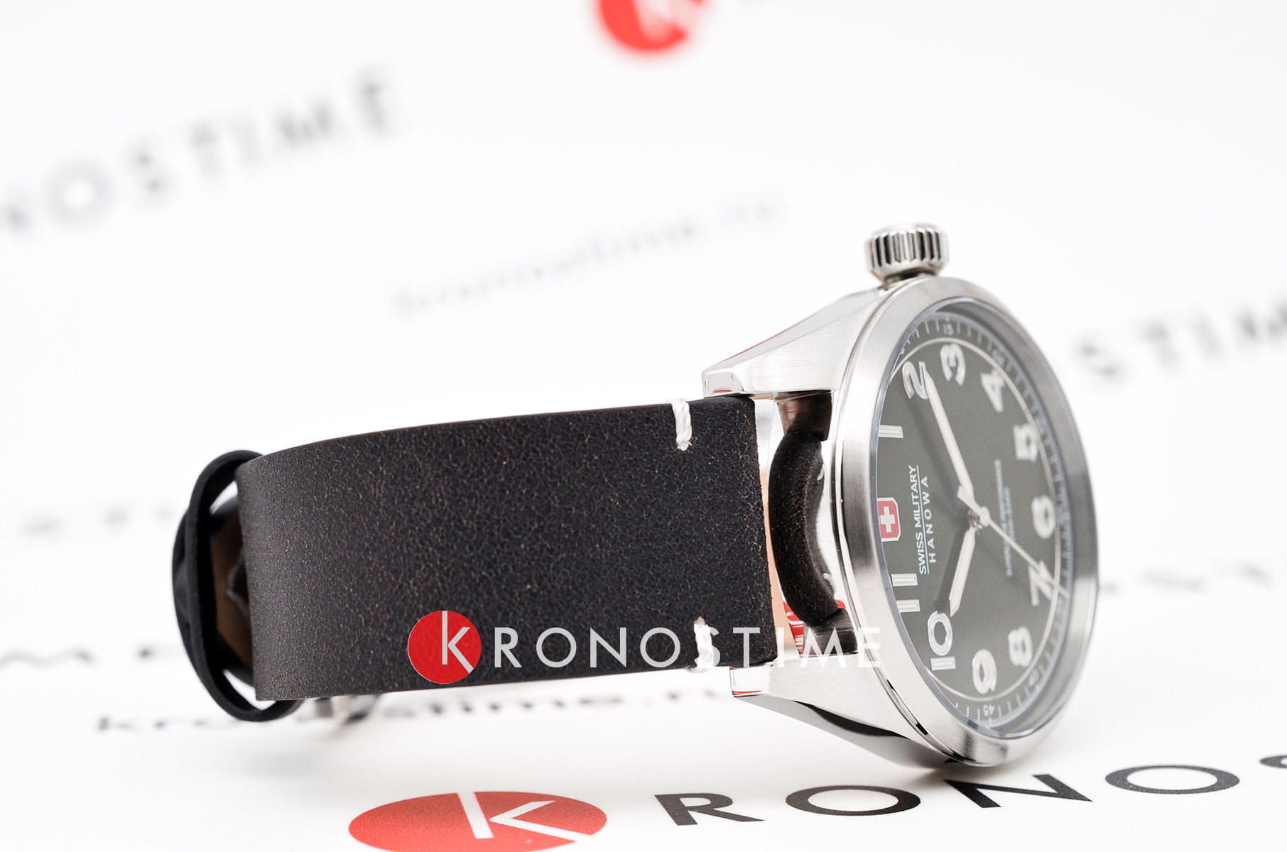 Мужские швейцарские часы Swiss Military Hanowa SMWGA2100404 с надёжным кварцевым механизмом. Сапфировое стеклоСапфировое стеклоПрочный и надёжный материал из кристалла сапфира синтетического происхождения, характеризующийся особой твёрдостью и устойчивостью к царапинам и повреждениям. устойчивое к мелким механическим повреждениям. Корпус часов изготовлен из нержавеющей стали. Кожаный браслет на стандартной застёжке. Стрелки и метки с люминесцентным покрытиемЛюминесцентное покрытиеПозволяет считывать показания времени в темноте. Производители наносят на стрелки, часовые индексы, безель или поверхность циферблата светонакопительный состав, дающий холодное свечение.. Окошко даты находится в положении 3 часа. Класс водозащиты: 100 метров, позволит плавать, нырять и заниматься другими водными видами спорта.