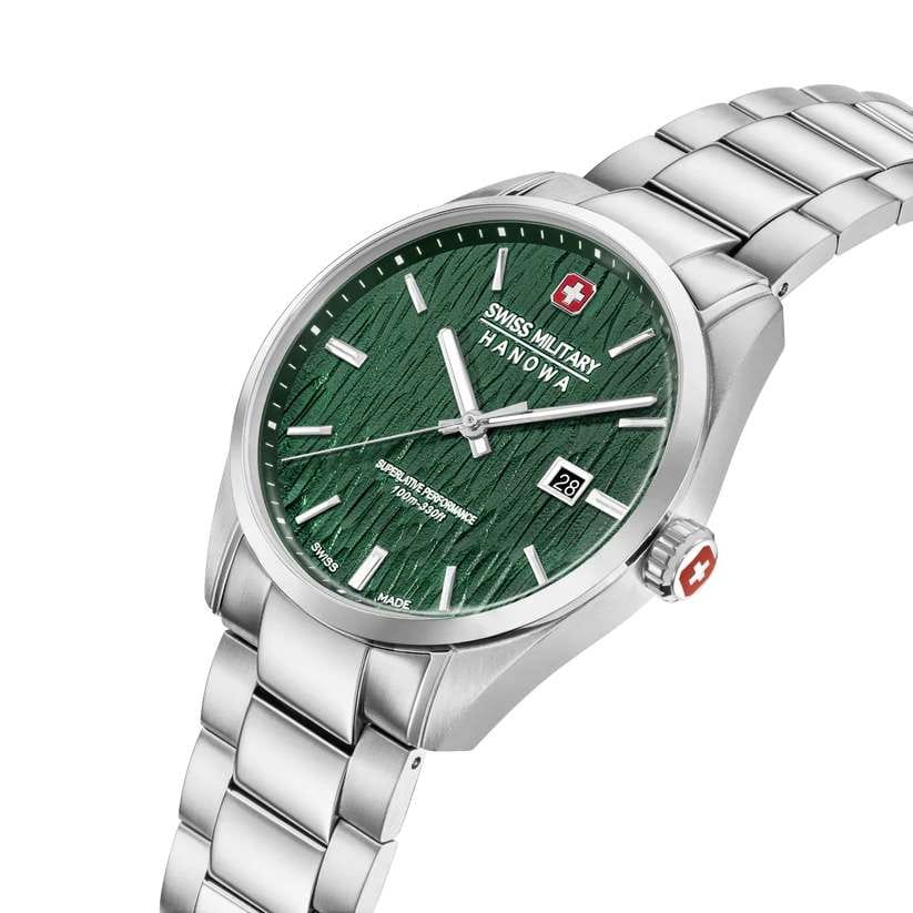 Мужские швейцарские часы Swiss Military Hanowa SMWGH0006101 – это элегантные часы, сочетающие в себе классический дизайн и современную функциональность. Корпус из нержавеющей стали диаметром 42 мм сбалансирован и элегантен. Сапфировое стеклоСапфировое стеклоПрочный и надёжный материал из кристалла сапфира синтетического происхождения, характеризующийся особой твёрдостью и устойчивостью к царапинам и повреждениям. с антибликовым покрытием защищает циферблат от царапин и обеспечивает отличную читаемость при любом освещении. Браслет с раскладной застёжкойРаскладная застёжкаТакой тип застёжки используется только на браслетах из металла. Она никогда не раскрывается полностью, происходит разделение на 2 и более частей. Раскладывающая застёжка снизит вероятность потери часов к минимуму. идеально дополняют дизайн часов, обеспечивая комфортное ношение. Люминесцентное покрытиеЛюминесцентное покрытиеПозволяет считывать показания времени в темноте. Производители наносят на стрелки, часовые индексы, безель или поверхность циферблата светонакопительный состав, дающий холодное свечение. стрелок и меток позволит вам следить за временем даже в полной темноте. Индикатор даты в положении 3 часа. Водонепроницаемость до 100 метров хорошо подходят для повседневного ношения и занятий водными видами спорта.