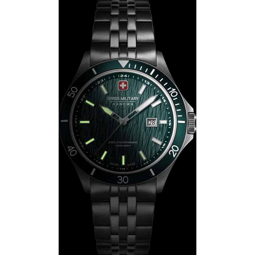 Мужские кварцевые часы Swiss Military Hanowa — швейцарская надёжность в классическом исполнении. Корпус круглый, из нержавеющей стали, диаметром 42 мм. Циферблат — зелёный с серебристыми стрелками. Стекло — сапфировоеСапфировое стеклоПрочный и надёжный материал из кристалла сапфира синтетического происхождения, характеризующийся особой твёрдостью и устойчивостью к царапинам и повреждениям.. Механизм — швейцарский кварцевый Ronda 505 с функцией (остановка секундной стрелки для точной настройки). БезельБезельВнешний ободок, закрепляющий стекло. В спортивных часах так называется поворотное кольцо с делениями на циферблате, выполняет роль таймера – замеряет отрезки времени на шкале. Неподвижный безель – элемент декора. Однонаправленно вращающийся безель на дайверских часах позволяет фиксировать моменты погружения и выныривания на поверхность. — неподвижный, из нержавеющей стали с IP-покрытиемIP-покрытиеМетод ионного напыления. Демонстрирует повышенную устойчивость к истиранию, окислению и химическим веществам. Под воздействием высокого давления и температуры около 1500°C молекулы металла надёжно соединяются с частицами корпуса часов.. Задняя крышка — завинчивающаяся. Водонепроницаемость 100 м. Браслет — стальной, на раскладной застёжке с кнопками и фиксаторомРаскладная застёжкаТакой тип застёжки используется только на браслетах из металла. Она никогда не раскрывается полностью, происходит разделение на 2 и более частей. Раскладывающая застёжка снизит вероятность потери часов к минимуму.. Идеальный выбор для тех, кто ценит швейцарское качество и классический стиль.