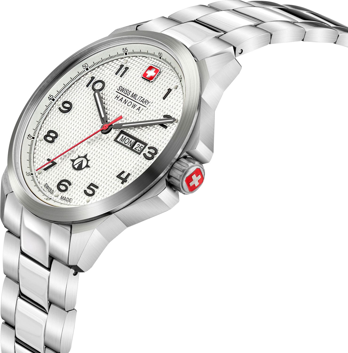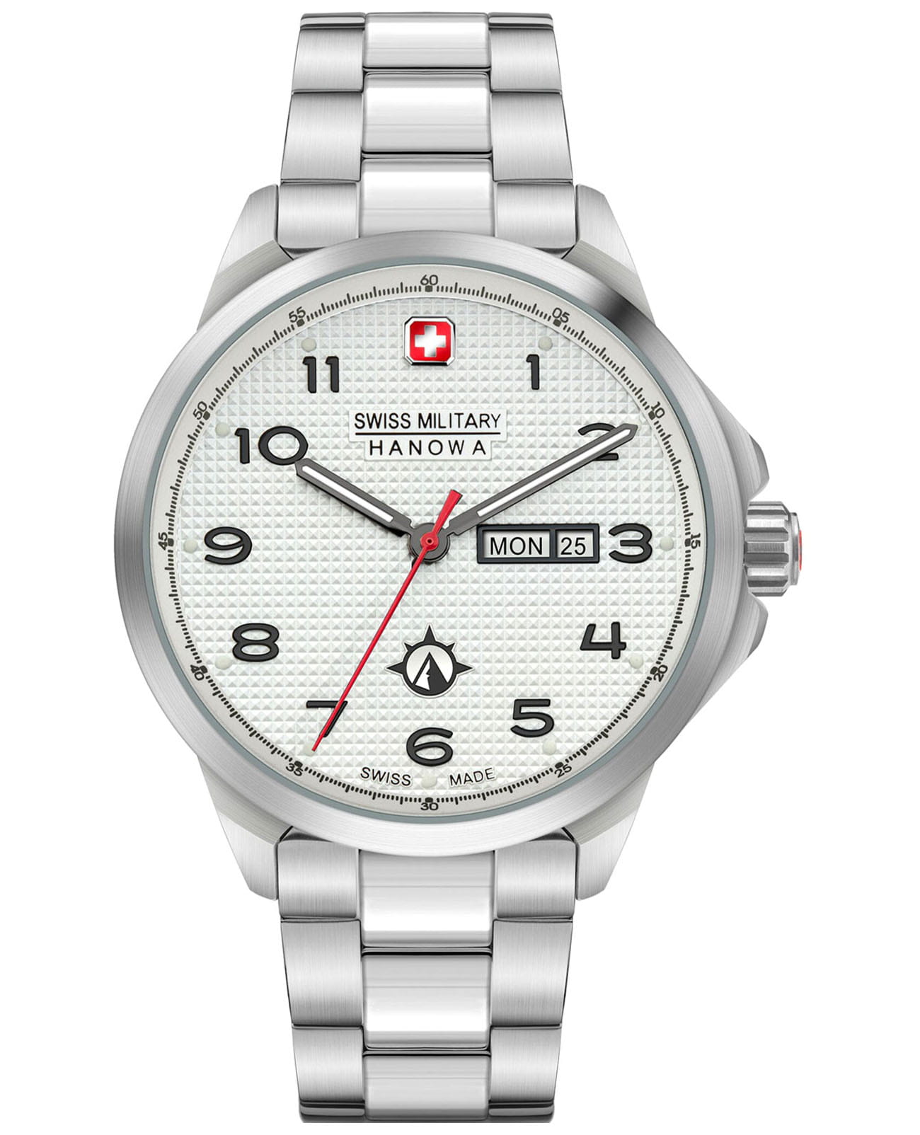 Швейцарские мужские часы Swiss Military Hanowa SMWGH2100302, кварцевый механизм с высокой точностью. Сапфировое стекло устойчивое к появлению царапин, обладающее высокой прозрачностью. Класс водозащиты: 100 метров, позволит плавать, нырять и заниматься другими водными видами спорта. Классический круглый стальной корпус, защищенный сапфировым стекломСапфировое стеклоПрочный и надёжный материал из кристалла сапфира синтетического происхождения, характеризующийся особой твёрдостью и устойчивостью к царапинам и повреждениям.. Циферблат украшен декоративным узором ячеистой структуры. Часовая и минутная стрелки с люминесцентным покрытиемЛюминесцентное покрытиеПозволяет считывать показания времени в темноте. Производители наносят на стрелки, часовые индексы, безель или поверхность циферблата светонакопительный состав, дающий холодное свечение.., которое светится в темноте после непродолжительной зарядки на свету. Окошки дня недели и даты находятся в положении 3 часа. Метки в виде арабских цифр, 12-ти часовая метка в виде фирменного логотипа. Рифленая заводная головка с защитой. Завинчивающаяся задняя крышка. Надежный стальной браслет с раскладной застёжкойРаскладная застёжкаТакой тип застёжки используется только на браслетах из металла. Она никогда не раскрывается полностью, происходит разделение на 2 и более частей. Раскладывающая застёжка снизит вероятность потери часов к минимуму.. Застежка с системой блокировки.