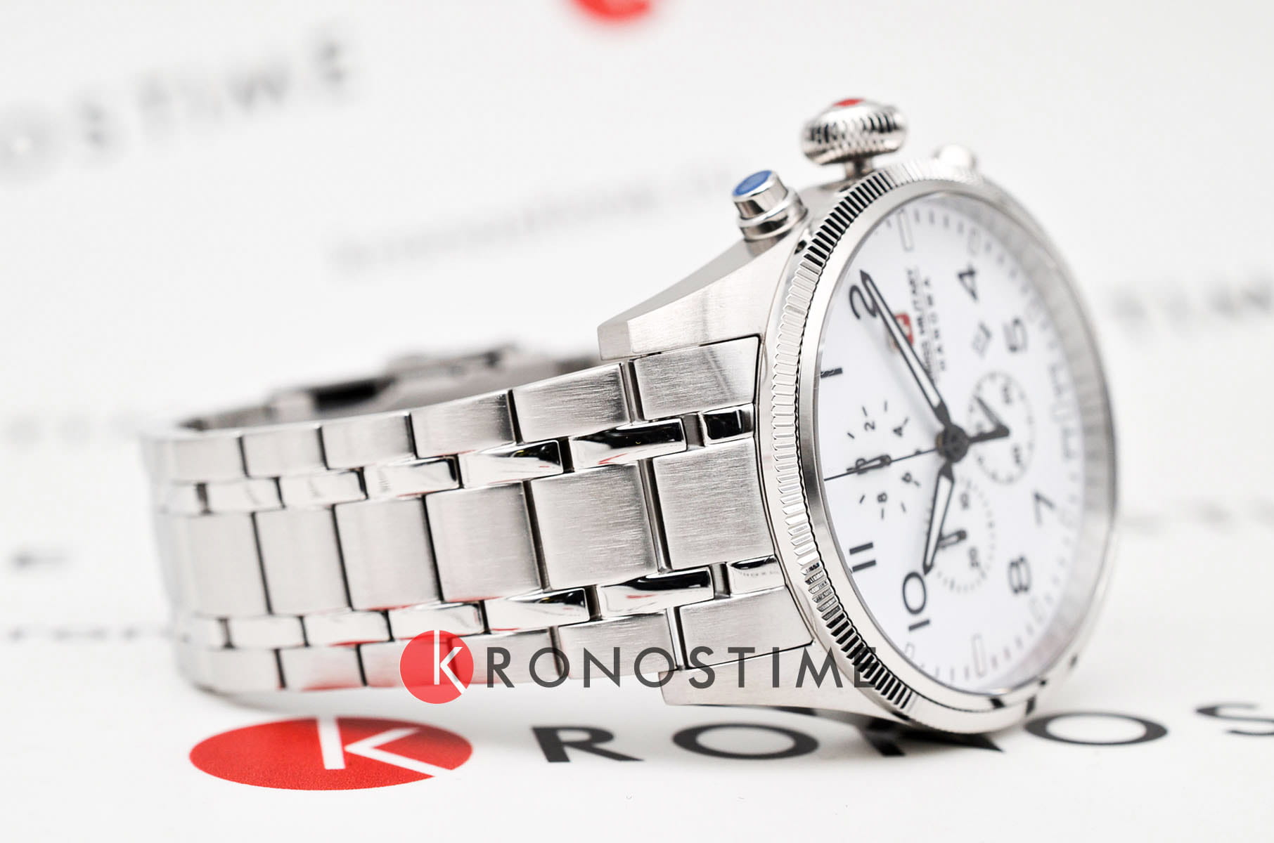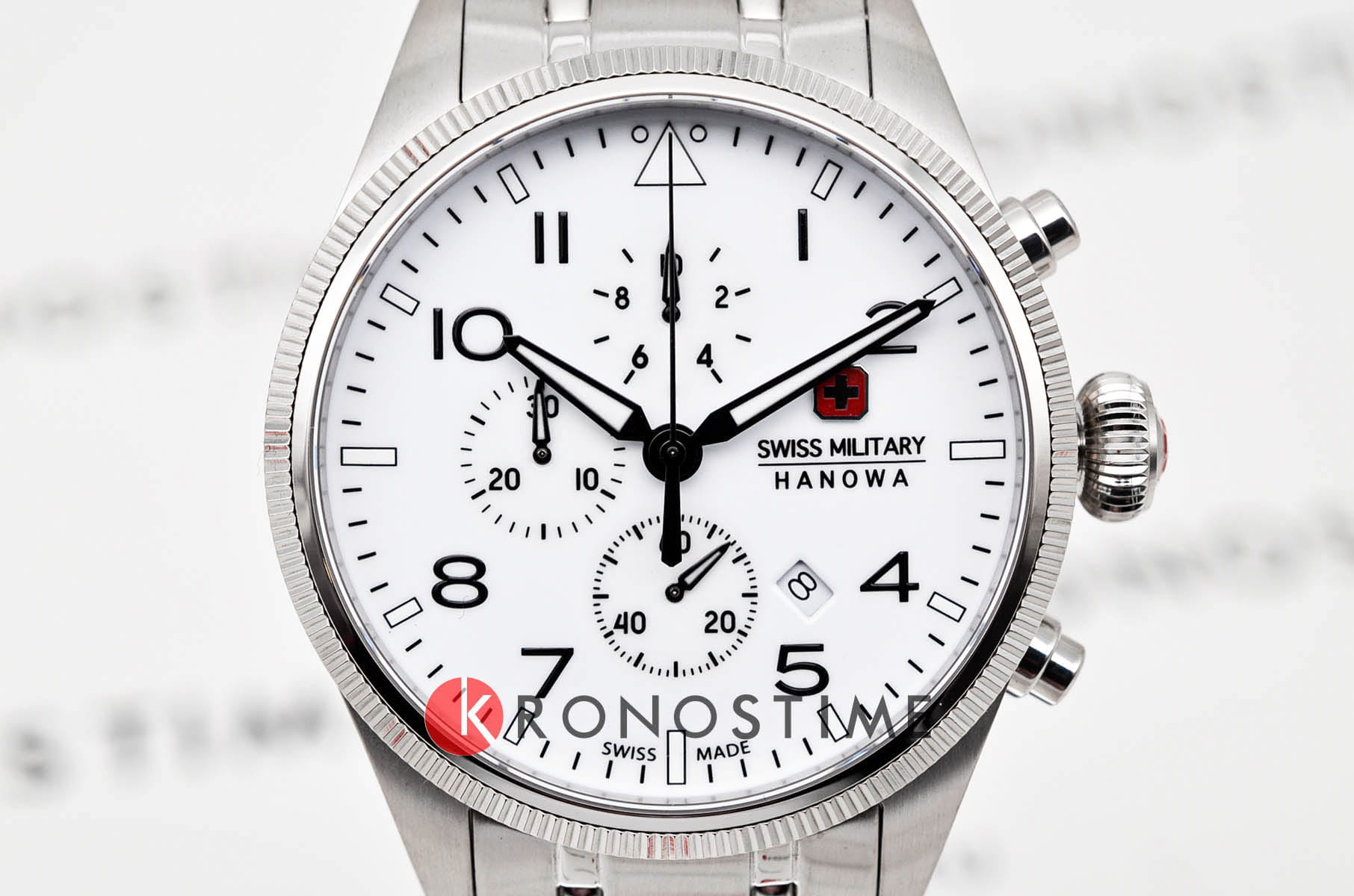 Мужские кварцевые часы-хронограф Swiss Military Hanowa — это прочный и стильный аксессуар. Корпус диаметром 43 мм выполнен из нержавеющей стали. Циферблат белого цвета оформлен арабскими цифрами и тремя субциферблатами хронографа. Окошко даты расположено в положении 3 часов. Стрелки и метки с люминесцентным покрытиемЛюминесцентное покрытиеПозволяет считывать показания времени в темноте. Производители наносят на стрелки, часовые индексы, безель или поверхность циферблата светонакопительный состав, дающий холодное свечение., обеспечивающим хорошую читаемость в темноте. Циферблат защищён сапфировым стекломСапфировое стеклоПрочный и надёжный материал из кристалла сапфира синтетического происхождения, характеризующийся особой твёрдостью и устойчивостью к царапинам и повреждениям.. Механизм — швейцарское кварцевое движение с функциями хронографаХронографФункция позволяет измерять отрезки времени с особой точностью: часы, минуты, секунды. Верным признаком хронографа является наличие на циферблате 3 дополнительных окошек-счётчиков. и секундомераСекундомерСекундоме́р — прибор, способный измерять интервалы времени с точностью до долей секунды.. Часы оснащены стальным браслетом на раскладной застёжкеРаскладная застёжкаТакой тип застёжки используется только на браслетах из металла. Она никогда не раскрывается полностью, происходит разделение на 2 и более частей. Раскладывающая застёжка снизит вероятность потери часов к минимуму.. В комплекте — дополнительный браслет. Водонепроницаемость 100 м позволяет использовать часы для плавания и повседневного ношения. Идеальный выбор для тех, кто ценит швейцарское качество и надёжность.