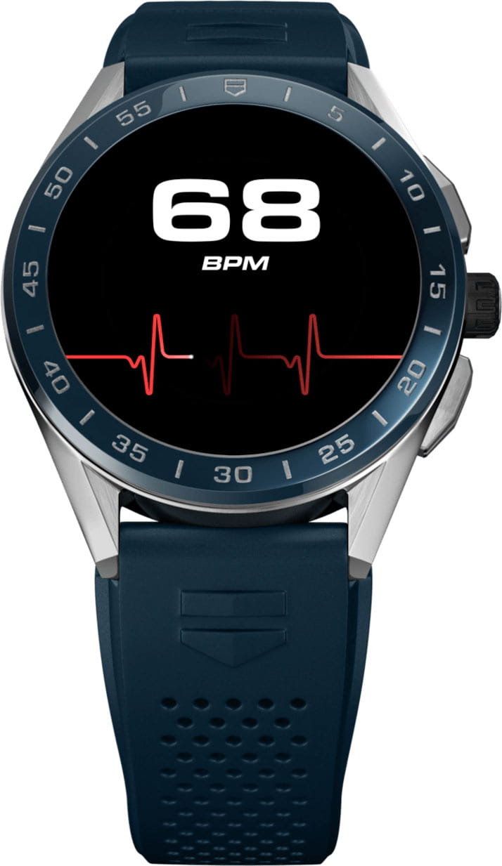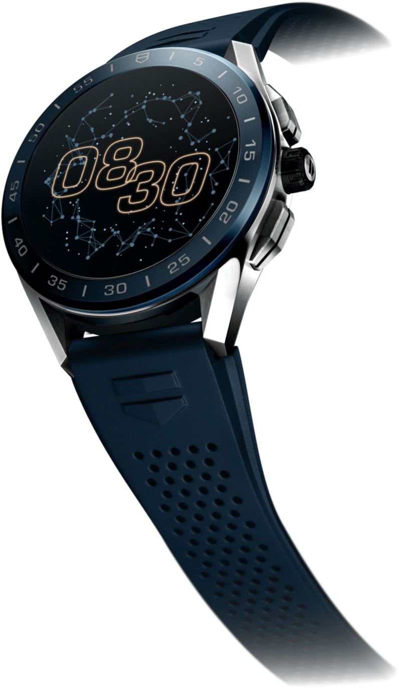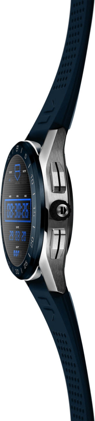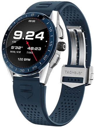 Циферблат из стали с черным покрытием диаметром 45 мм имеет идеально выполненную поверхность с чередованием полированных и матовых участков. Он прекрасно сочетается с неподвижным безелем из синей керамики и синим каучуковым ремешком в гоночной стилистике. Унисекс. Смарт-часы работают на базе четырехъядерного процессора Qualcomm® Snapdragon™ Wear 3100 и оснащены операционной системой Wear OS от Google. Совместимы с ОС Android 6.0+ (исключая версию Go) и iOS 10.0+. Встроенная система бесконтактной оплаты NFC (Google Pay). Микрофон. Голосовой помощник Google Assistant и Google Translate. Возможность установка приложений из Google Play. Возможность управления функциями телефона как через сенсорный дисплей, так и через функциональные кнопки и заводную головку. Подключение к интернету через Wi-Fi или с помощью интернета мобильного телефона. Синхронизация со смартфоном через Bluetooth. Поддержка спортивных онлайн-сообществ. Совместимость с приложением TAG Heuer Sports. Настраиваемые экраны: скелетонизированный циферблат мануфактурного механизма Heuer 02, цифровой механизм Carrera Heuer 01, анимация Orbital на основе уникальной нейросетевой модели, а также дисплей, вдохновленный фирменной спиралью баланса из углеродного композита на основе гексагональных нанотрубок. Настраиваемая подсветка (яркость/режим). Цветной сенсорный дисплей на органических светодиодах (OLED) размером 1,39'' и разрешением 454х454 пикселей (326 ppi). Второй часовой пояс. SPLIT-хронограф. Сервисы навигации GPS, GLONASS, BeiDou и QZSS. Пульсометр, компас, акселерометр, гироскоп, секундомер, таймер и будильник. Мониторинг количества израсходованных калорий. Вибро-оповещение. Перезаряжаемый аккумулятор 430мАч, которого хватает на сутки, включая часовую тренировку. Время полной подзарядки 1,5 часа. Керамический безель. Круглый корпус. Задняя крышка корпуса с винтовым креплением. Каучуковый ремешок с системой быстрой замены. В комплект входят магнитное зарядное устройство аккумулятора и специальный дорожный чехол.