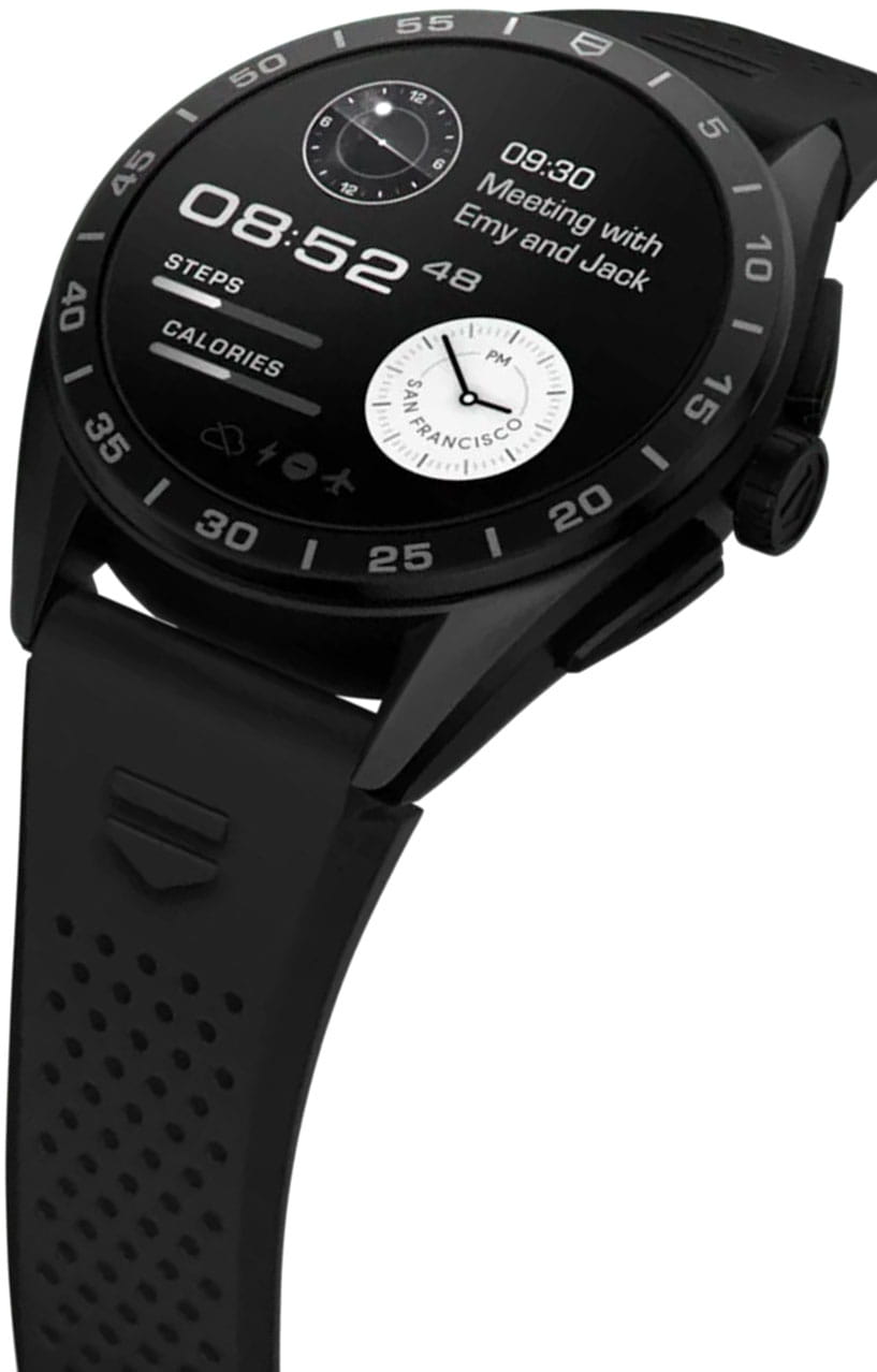 Швейцарские электронные унисекс часы TAG Heuer Connected Calibre E4 - 45 mm SBR8A80.BT6261, электронный механизм с высокой точностью. Сапфировое стекло устойчивое к появлению царапин, обладающее высокой прозрачностью. Класс водозащиты: 50 метров, позволит защитить корпус от случайных брызг или капель дождя. Корпус часов изготовлен из титана, черного цвета.