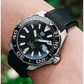 TAG Heuer Aquaracer WAY201A.FT6142 — это стильные и надежные часы для активного образа жизни. Корпус диаметром 43 мм выполнен из нержавеющей стали и дополнен безелемБезельВнешний ободок, закрепляющий стекло. В спортивных часах так называется поворотное кольцо с делениями на циферблате, выполняет роль таймера – замеряет отрезки времени на шкале. Неподвижный безель – элемент декора. Однонаправленно вращающийся безель на дайверских часах позволяет фиксировать моменты погружения и выныривания на поверхность. с черной керамической вставкой, обеспечивающей защиту от царапин. Четкие метки и стрелки на черном циферблате покрыты люминесцентным покрытиемЛюминесцентное покрытиеПозволяет считывать показания времени в темноте. Производители наносят на стрелки, часовые индексы, безель или поверхность циферблата светонакопительный состав, дающий холодное свечение., что гарантирует превосходную читаемость в темноте. Циферблат защищает сапфировое стеклоСапфировое стеклоПрочный и надёжный материал из кристалла сапфира синтетического происхождения, характеризующийся особой твёрдостью и устойчивостью к царапинам и повреждениям. с антибликовым покрытиемАнтибликовое покрытиеСлой оксида металла в 0,13-0,3 микрон, благодаря которому стекло часов не бликует и не отражает свет. Антибликовое покрытие уменьшает отражение света в 10 раз, обеспечивая отличную читаемость показателей циферблата.. Внутри установлен автоматический механизм TAG Heuer Calibre 5, обеспечивающий надежную точность хода. Часы комплектуются прочным каучуковым ремешком, а раскладная застёжкаРаскладная застёжкаТакой тип застёжки используется только на браслетах из металла. Она никогда не раскрывается полностью, происходит разделение на 2 и более частей. Раскладывающая застёжка снизит вероятность потери часов к минимуму. с предохранительными кнопками гарантирует надежную фиксацию на запястье. Водонепроницаемость до 300 метров делает модель идеальной для плавания и дайвинга.