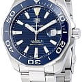 TAG Heuer Aquaracer WAY201B.BA0927 — стильные и надёжные часы, созданные для активного образа жизни и погружений. Корпус диаметром 43 мм выполнен из нержавеющей стали с матовой и полированной отделкой, что придаёт модели элегантный и динамичный вид. Однонаправленный вращающийся безельБезельВнешний ободок, закрепляющий стекло. В спортивных часах так называется поворотное кольцо с делениями на циферблате, выполняет роль таймера – замеряет отрезки времени на шкале. Неподвижный безель – элемент декора. Однонаправленно вращающийся безель на дайверских часах позволяет фиксировать моменты погружения и выныривания на поверхность. с керамической вставкой глубокого синего цвета оснащён минутной разметкой и светящимся маркером на позиции «12 часов», обеспечивая удобство при отсчёте времени погружения. Синий циферблат с горизонтальным гильоше дополнен накладными часовыми индексами и стрелками с люминесцентным покрытиемЛюминесцентное покрытиеПозволяет считывать показания времени в темноте. Производители наносят на стрелки, часовые индексы, безель или поверхность циферблата светонакопительный состав, дающий холодное свечение., что гарантирует превосходную читаемость в любых условиях освещения. Окошко даты с увеличительным стеклом расположено на отметке «3 часа» для удобства. Защиту циферблата обеспечивает сапфировое стеклоСапфировое стеклоПрочный и надёжный материал из кристалла сапфира синтетического происхождения, характеризующийся особой твёрдостью и устойчивостью к царапинам и повреждениям. с антибликовым покрытиемАнтибликовое покрытиеСлой оксида металла в 0,13-0,3 микрон, благодаря которому стекло часов не бликует и не отражает свет. Антибликовое покрытие уменьшает отражение света в 10 раз, обеспечивая отличную читаемость показателей циферблата.. Внутри установлен швейцарский автоматический механизм Calibre 5, обеспечивающий точность хода и запас энергии до 38 часов. Часы укомплектованы браслетом из нержавеющей стали с чередующейся полированной и матовой отделкой, а раскладная застёжкаРаскладная застёжкаТакой тип застёжки используется только на браслетах из металла. Она никогда не раскрывается полностью, происходит разделение на 2 и более частей. Раскладывающая застёжка снизит вероятность потери часов к минимуму. с двойной блокировкой и кнопками гарантирует надёжную фиксацию на запястье. Водонепроницаемость 300 метров делает модель идеальным выбором для занятий водными видами спорта, включая дайвинг.