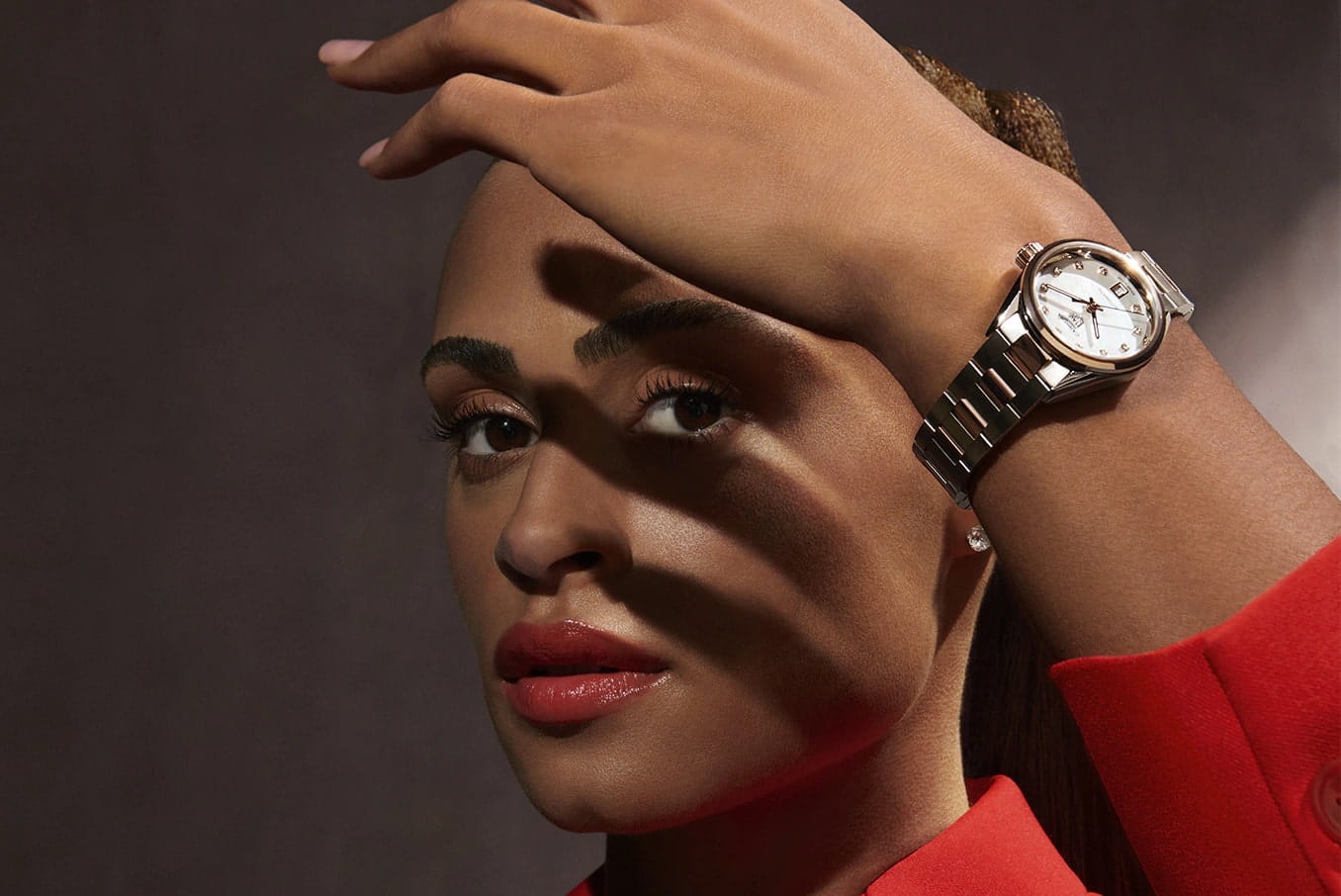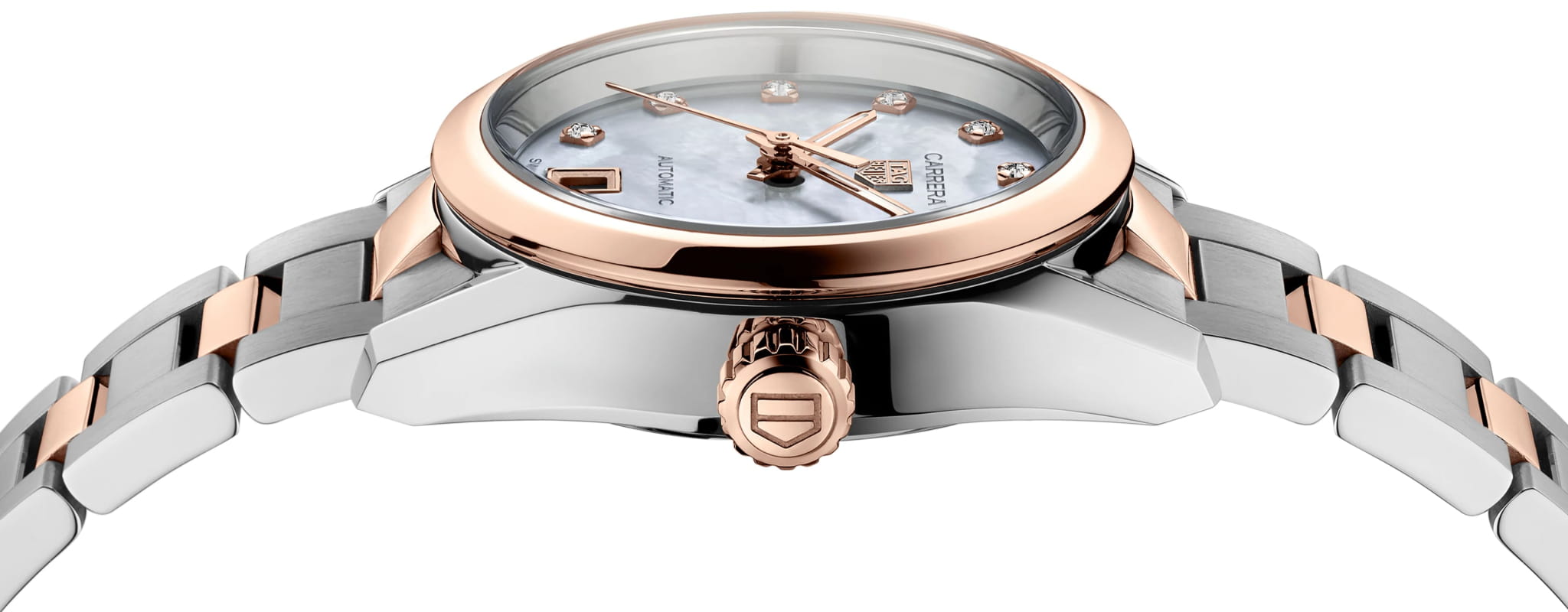 Эта знаковая и стильная версия культовых часов TAG Heuer Carrera Date выполнена из цельного розового золота 18 карат 5N и стали с 11 бриллиантами размером 1,30 мм (0,088 карата). На изысканном перламутровом циферблате: указатель даты в положении «6 часов» и Super-Luminova® заполненные стрелки и метки. Изысканный полированный стальной корпус диаметром 29 мм и безельБезельВнешний ободок, закрепляющий стекло. В спортивных часах так называется поворотное кольцо с делениями на циферблате, выполняет роль таймера – замеряет отрезки времени на шкале. Неподвижный безель – элемент декора. Однонаправленно вращающийся безель на дайверских часах позволяет фиксировать моменты погружения и выныривания на поверхность. из цельного розового золота 18 карат18-каратное золотоОбозначение по каратной системе пробирования, оно показывает, сколько драгоценного металла содержится в изделии. 18 карат - в составе 75% чистого золота, соответствует 750 пробе.