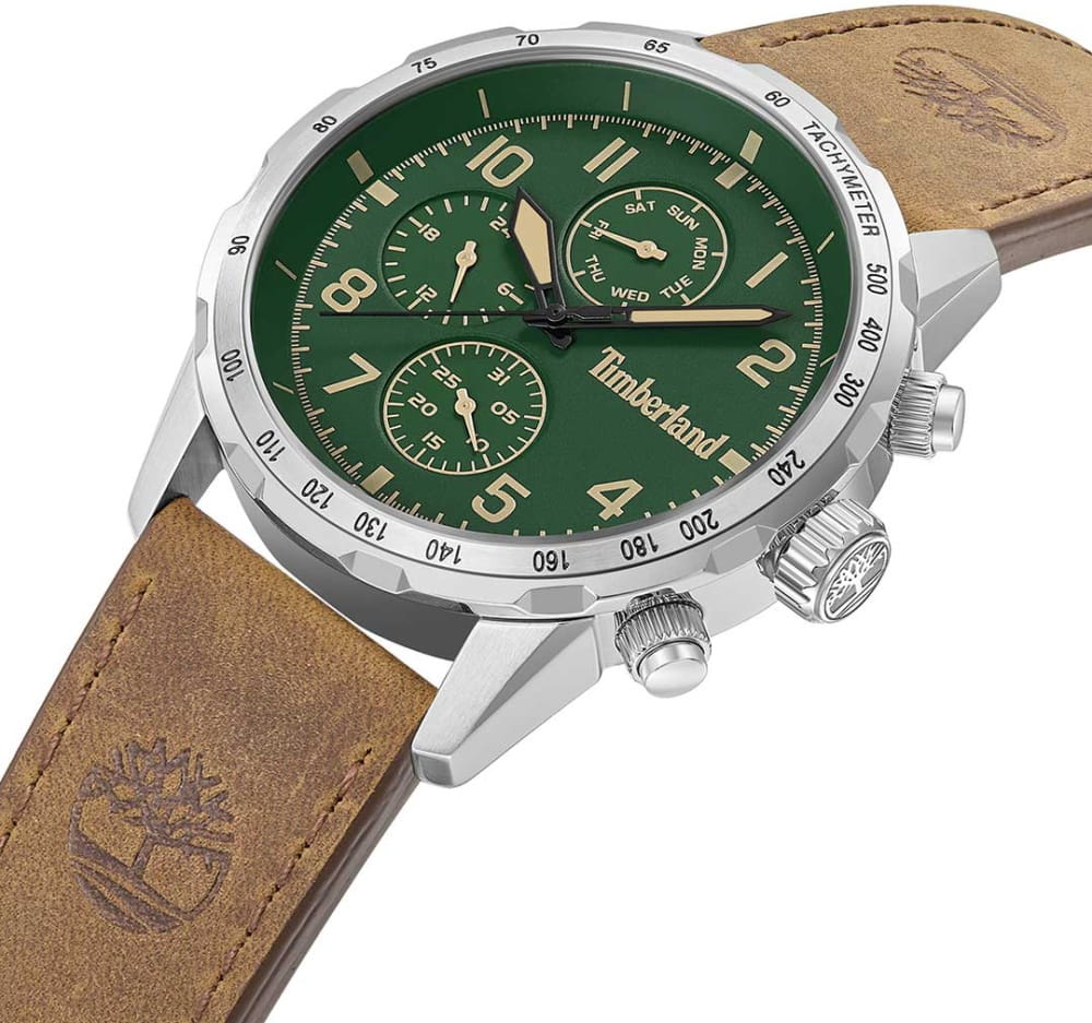Американские мужские часы-хронографХронографФункция позволяет измерять отрезки времени с особой точностью: часы, минуты, секунды. Верным признаком хронографа является наличие на циферблате 3 дополнительных окошек-счётчиков. c тахиметромТахиметрРазмеченная шкала, располагается на ободке или безеле часов. Тахиметр позволяет рассчитать скорость на определённом участке пути, расстояние измеряется в километрах или милях. Timberland TDWGF0055402 — это сочетание надежности, функциональности и уверенного стиля. Модель идеально подойдет для тех, кто ценит точность и выносливость в каждой детали. Часы оснащены кварцевым механизмом , гарантирующим высокую точность хода и минимальное обслуживание. В конструкции использовано прочное минеральное стеклоМинеральное стеклоМинеральное стекло представляет собой искусственно выращенный минерал кварца. Такое стекло отличается особой устойчивостью к повреждениям и царапинам. Уступает по некоторым качествам сапфировому стеклу., устойчивое к мелким повреждениям и долговечное в использовании. Корпус выполнен из нержавеющей стали, что обеспечивает стойкость к царапинам и длительный срок службы без потери внешнего вида. Стрелки часов имеют люминесцентное покрытиеЛюминесцентное покрытиеПозволяет считывать показания времени в темноте. Производители наносят на стрелки, часовые индексы, безель или поверхность циферблата светонакопительный состав, дающий холодное свечение., позволяющее считывать время даже в условиях слабого освещения. Дизайн дополнен кожаным ремешком с классической застежкой и системой быстрой замены , что делает использование часов максимально удобным и комфортным при ежедневной носке. Класс водозащиты WR50 позволяет использовать часы в повседневных условиях, включая мытьё рук или прогулки под дождем.