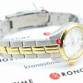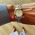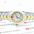 Дизайнеры придали модели немного шарма за счёт корпуса браслета с золотистым PVD-покрытием и минималистичного перламутрового циферблата. Часы оснащены высокоточным кварцевым калибром ETA F03.111, не нуждаются в заводе. Стрелки с люминесцентным покрытиемЛюминесцентное покрытиеПозволяет считывать показания времени в темноте. Производители наносят на стрелки, часовые индексы, безель или поверхность циферблата светонакопительный состав, дающий холодное свечение.. Сапфировое стекло противостоит появлению царапин. Водостойкость до 10 бар. . Индикация числа, функция EOLEOLПредставляет собой систему, уведомляющую владельца часов о необходимости замены элемента питания. За 2 недели до полного разряда батарейки секундная стрелка перестаёт ходить чётко и начинает перепрыгивать на 3-4 деления.. Габариты: 25 x 25 x 6,9 мм.
