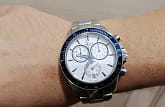 Спортивный высокоточный хронографХронографФункция позволяет измерять отрезки времени с особой точностью: часы, минуты, секунды. Верным признаком хронографа является наличие на циферблате 3 дополнительных окошек-счётчиков. в белом цвете дополнен броским синим безелемБезельВнешний ободок, закрепляющий стекло. В спортивных часах так называется поворотное кольцо с делениями на циферблате, выполняет роль таймера – замеряет отрезки времени на шкале. Неподвижный безель – элемент декора. Однонаправленно вращающийся безель на дайверских часах позволяет фиксировать моменты погружения и выныривания на поверхность. со шкалой , сочетание оттенков смотрится весьма гармонично. Работа часов осуществляется благодаря кварцевому калибру ETA G10.212 с высокой точностью хода. Стекло из сапфира устойчиво к образованию царапин. Браслет и корпус из долговечной стали 316L, противостоящей возникновению коррозии. . Секундомер, индикация числа. Габариты: 42,5 x 42,5 x 11,2 мм.
