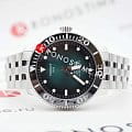 На фоне серебристого браслета и темного безеляБезельВнешний ободок, закрепляющий стекло. В спортивных часах так называется поворотное кольцо с делениями на циферблате, выполняет роль таймера – замеряет отрезки времени на шкале. Неподвижный безель – элемент декора. Однонаправленно вращающийся безель на дайверских часах позволяет фиксировать моменты погружения и выныривания на поверхность. ярко выделяется зеленый циферблат, отлично видны серебристые стрелки и часовые метки с люминесцентным покрытиемЛюминесцентное покрытиеПозволяет считывать показания времени в темноте. Производители наносят на стрелки, часовые индексы, безель или поверхность циферблата светонакопительный состав, дающий холодное свечение.. Механические часы с автоподзаводом оснащены швейцарским механизмом Powermatic 80Powermatic 80Эксклюзивный калибр от швейцарской компании ETA с увеличенным запасом хода до 80 часов за счёт удлинённой заводной пружины. Характеризуется улучшенной системой спуска со сниженным трением. с запасом хода 80 часов. Завинчивающиеся кнопки, головка, прозрачная задняя крышка. Сапфировое стекло. Апертура даты. Габариты: 43 x 43 x 12,7 мм.
