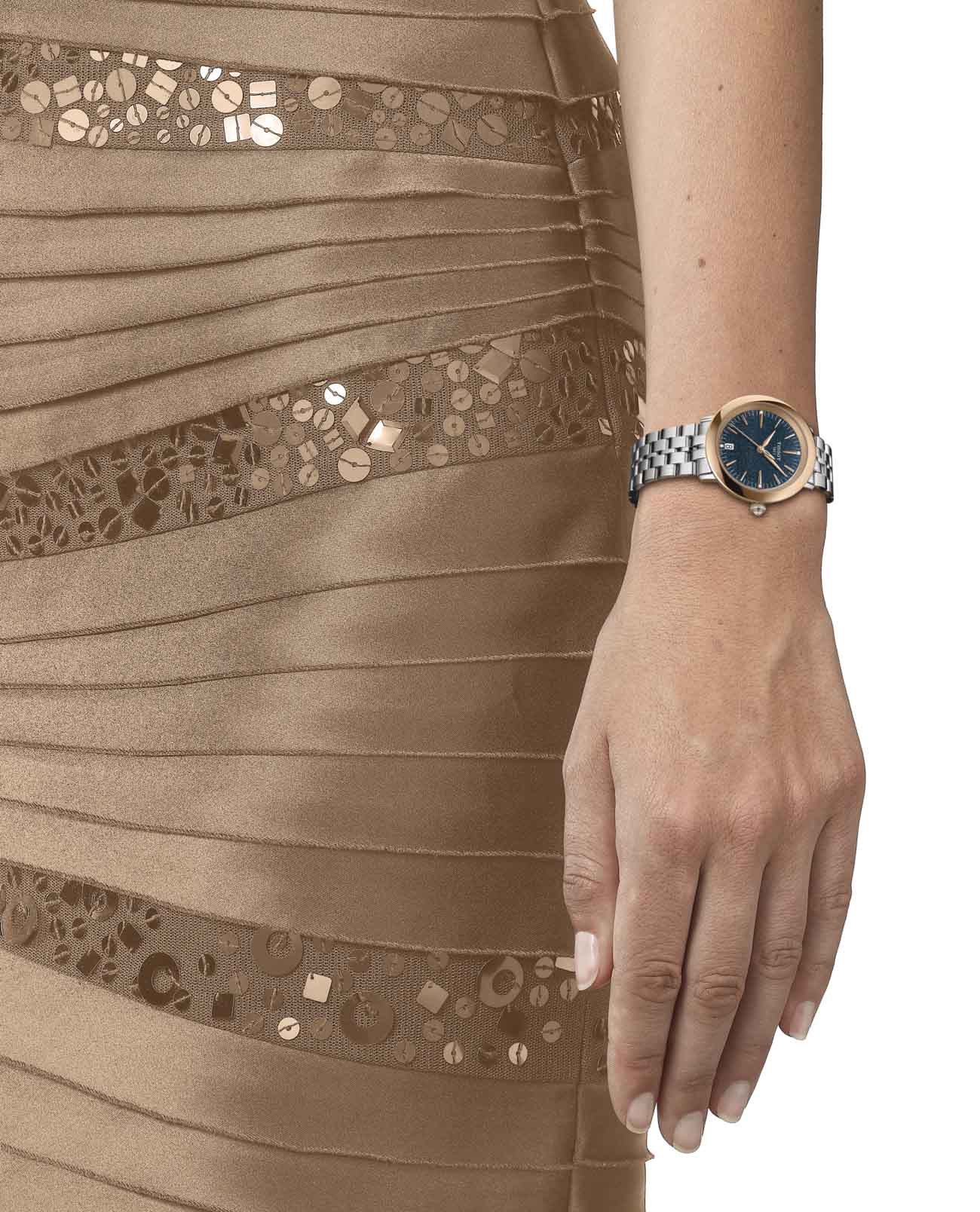 Оригинальный циферблат идеально смотрится в сочетании с элегантным безелемБезельВнешний ободок, закрепляющий стекло. В спортивных часах так называется поворотное кольцо с делениями на циферблате, выполняет роль таймера – замеряет отрезки времени на шкале. Неподвижный безель – элемент декора. Однонаправленно вращающийся безель на дайверских часах позволяет фиксировать моменты погружения и выныривания на поверхность., выполненным из 18-ти каратного розового золота18-каратное золотоОбозначение по каратной системе пробирования, оно показывает, сколько драгоценного металла содержится в изделии. 18 карат - в составе 75% чистого золота, соответствует 750 пробе.