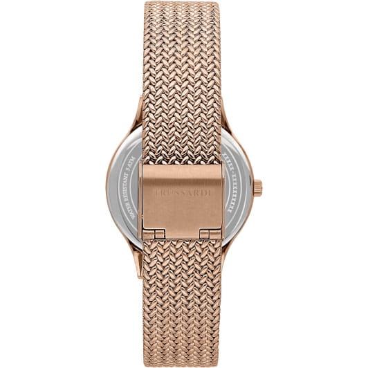 Итальянские женские часы Trussardi T-Star R2453152505 - это стильный женский аксессуар, который сочетает элегантный дизайн и практичность. Корпус выполнен из нержавеющей стали с IP-покрытиемIP-покрытиеМетод ионного напыления. Демонстрирует повышенную устойчивость к истиранию, окислению и химическим веществам. Под воздействием высокого давления и температуры около 1500°C молекулы металла надёжно соединяются с частицами корпуса часов., что обеспечивает долговечность и утончённый внешний вид. Надежное минеральное стеклоМинеральное стеклоМинеральное стекло представляет собой искусственно выращенный минерал кварца. Такое стекло отличается особой устойчивостью к повреждениям и царапинам. Уступает по некоторым качествам сапфировому стеклу. защищает циферблат от царапин и обеспечивает долговечность. Циферблат украшен кристаллами. Модель оснащена кварцевым механизмом, обеспечивающим высокую точность хода. Браслет из нержавеющей стали с IP-покрытиемIP-покрытиеМетод ионного напыления. Демонстрирует повышенную устойчивость к истиранию, окислению и химическим веществам. Под воздействием высокого давления и температуры около 1500°C молекулы металла надёжно соединяются с частицами корпуса часов. с раскладным замкомРаскладной замокДанный вариант застежки используется только на часах с металлическим браслетом. Отличительная особенность такого крепления в том, что длина браслета становится универсальной и вы можете самостоятельно отрегулировать нужный вам размер – застежка просто двигается по браслету часов. обеспечивает комфортное ношение. Водозащита 50 метров позволит защитить корпус от случайных брызг или капель дождя. Эта модель – отличный выбор для тех, кто ищет сочетание стиля, качества и функциональности. Часы станут не только полезным аксессуаром, но и выразительным элементом вашего имиджа.