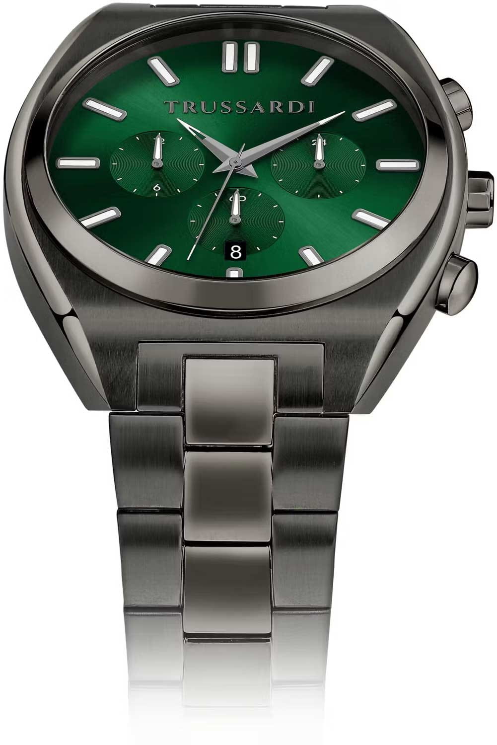 Итальянские мужские часы Trussardi Metropolitan R2453159001- это стильный мужской аксессуар, который сочетает элегантный дизайн и практичность. Корпус выполнен из нержавеющей стали с IP-покрытиемIP-покрытиеМетод ионного напыления. Демонстрирует повышенную устойчивость к истиранию, окислению и химическим веществам. Под воздействием высокого давления и температуры около 1500°C молекулы металла надёжно соединяются с частицами корпуса часов., что обеспечивает долговечность и утончённый внешний вид. Надежное минеральное стеклоМинеральное стеклоМинеральное стекло представляет собой искусственно выращенный минерал кварца. Такое стекло отличается особой устойчивостью к повреждениям и царапинам. Уступает по некоторым качествам сапфировому стеклу. защищает циферблат от царапин и обеспечивает долговечность. Модель оснащена кварцевым механизмом, обеспечивающим высокую точность хода. Браслет из нержавеющей стали с IP-покрытиемIP-покрытиеМетод ионного напыления. Демонстрирует повышенную устойчивость к истиранию, окислению и химическим веществам. Под воздействием высокого давления и температуры около 1500°C молекулы металла надёжно соединяются с частицами корпуса часов.  с раскладной застёжкойРаскладная застёжкаТакой тип застёжки используется только на браслетах из металла. Она никогда не раскрывается полностью, происходит разделение на 2 и более частей. Раскладывающая застёжка снизит вероятность потери часов к минимуму. обеспечивает комфортное ношение. Водозащита 50 метров позволит защитить корпус от случайных брызг или капель дождя. Вынесенный циферблат с 24-х и 12-ти часовым указателем времени, а также вынесенный циферблат c хронографомХронографФункция позволяет измерять отрезки времени с особой точностью: часы, минуты, секунды. Верным признаком хронографа является наличие на циферблате 3 дополнительных окошек-счётчиков.. Окошко даты находится в положении 6 часов. Стрелки и метки оснащены люминесцентным покрытиемЛюминесцентное покрытиеПозволяет считывать показания времени в темноте. Производители наносят на стрелки, часовые индексы, безель или поверхность циферблата светонакопительный состав, дающий холодное свечение., обеспечивающим отличную видимость даже при слабом освещении. Эта модель – отличный выбор для тех, кто ищет сочетание стиля, качества и функциональности. Часы станут не только полезным аксессуаром, но и выразительным элементом вашего имиджа.