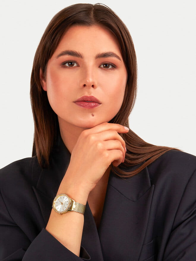 Итальянские женские часы Trussardi T-Vision R2453170504 - это стильный женский аксессуар, который сочетает элегантный дизайн и практичность. Корпус выполнен из нержавеющей стали с IP-покрытиемIP-покрытиеМетод ионного напыления. Демонстрирует повышенную устойчивость к истиранию, окислению и химическим веществам. Под воздействием высокого давления и температуры около 1500°C молекулы металла надёжно соединяются с частицами корпуса часов., что обеспечивает долговечность и утончённый внешний вид. Надежное минеральное стеклоМинеральное стеклоМинеральное стекло представляет собой искусственно выращенный минерал кварца. Такое стекло отличается особой устойчивостью к повреждениям и царапинам. Уступает по некоторым качествам сапфировому стеклу. защищает циферблат от царапин и обеспечивает долговечность. Корпус и циферблат украшены кристаллами. Модель оснащена кварцевым механизмом, обеспечивающим высокую точность хода. Окошко даты в положении 3 часов. Браслет из нержавеющей стали с IP-покрытиемIP-покрытиеМетод ионного напыления. Демонстрирует повышенную устойчивость к истиранию, окислению и химическим веществам. Под воздействием высокого давления и температуры около 1500°C молекулы металла надёжно соединяются с частицами корпуса часов. с раскладным замкомРаскладной замокДанный вариант застежки используется только на часах с металлическим браслетом. Отличительная особенность такого крепления в том, что длина браслета становится универсальной и вы можете самостоятельно отрегулировать нужный вам размер – застежка просто двигается по браслету часов. обеспечивает комфортное ношение. Стрелки оснащены люминесцентным покрытиемЛюминесцентное покрытиеПозволяет считывать показания времени в темноте. Производители наносят на стрелки, часовые индексы, безель или поверхность циферблата светонакопительный состав, дающий холодное свечение., обеспечивающим отличную видимость даже при слабом освещении. Водозащита 50 метров позволит защитить корпус от случайных брызг или капель дождя. Эта модель – отличный выбор для тех, кто ищет сочетание стиля, качества и функциональности. Часы станут не только полезным аксессуаром, но и выразительным элементом вашего имиджа.