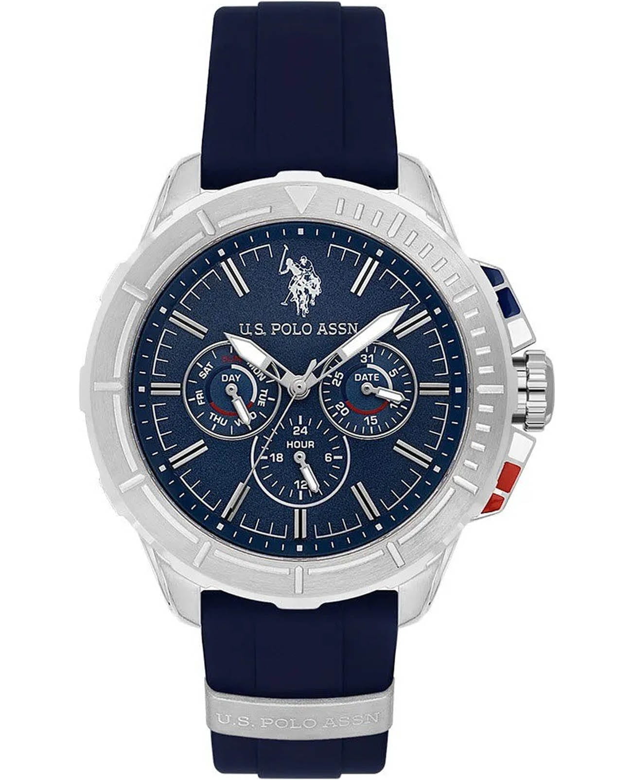 Мужские изысканные американские часы U.S. Polo Assn. Crossing USPA1066-02, кварцевый механизм с высокой точностью. Минеральное стеклоМинеральное стеклоМинеральное стекло представляет собой искусственно выращенный минерал кварца. Такое стекло отличается особой устойчивостью к повреждениям и царапинам. Уступает по некоторым качествам сапфировому стеклу. устойчивое к появлению царапин, обладающее высокой прозрачностью. Корпус изготовлен из нержавеющей стали с поворотным безелемБезельВнешний ободок, закрепляющий стекло. В спортивных часах так называется поворотное кольцо с делениями на циферблате, выполняет роль таймера – замеряет отрезки времени на шкале. Неподвижный безель – элемент декора. Однонаправленно вращающийся безель на дайверских часах позволяет фиксировать моменты погружения и выныривания на поверхность.. На стильном синем циферблате три дополнительных индикатора. Центральные часовая, минутная и секундная стрелки. Индикация даты и дня недели. 12/24х часовой формат времени. Класс водозащиты: 50 метров, позволит защитить корпус от случайных брызг или капель дождя. Силиконовый ремешок синего цвета со стандартной застежкой безупречно дополняет корпус. Стрелки оснащены люминесцентным покрытиемЛюминесцентное покрытиеПозволяет считывать показания времени в темноте. Производители наносят на стрелки, часовые индексы, безель или поверхность циферблата светонакопительный состав, дающий холодное свечение., обеспечивающим хорошую читаемость в темноте. Модель подчёркивает индивидуальность владельца и идеально подходит как для повседневного, так и для делового образа.
