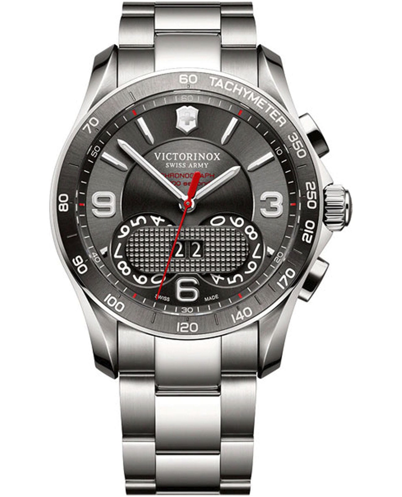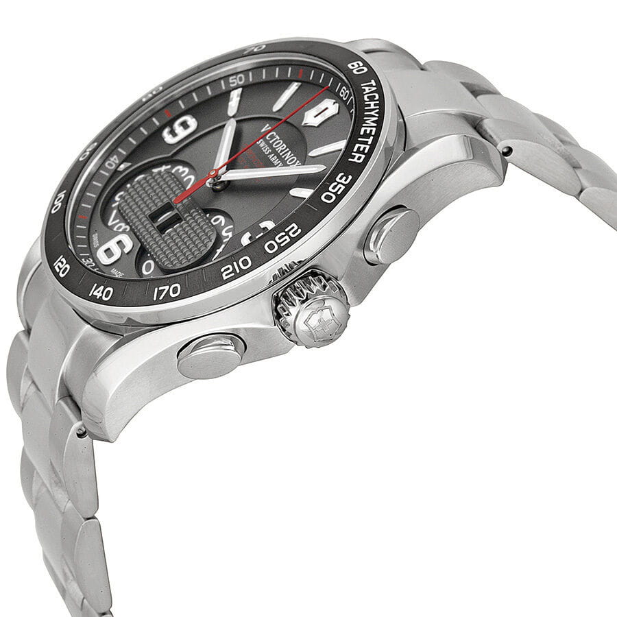 Мужские швейцарские часы Victorinox Swiss Army CHRONO CLASSIC 1/100 V241618 – это премиальный кварцевый хронограф с уникальным функционалом, представленный в круглом корпусе диаметром 41 мм из нержавеющей стали 316L с частичным PVD-покрытиемPVDУльтратонкое покрытие наносится в технике вакуумного напыления, сочетает в себе нитрид титана особой прочности со слоем золота или оксида хрома. Несёт в себе декоративную или защитную функцию. и серым гильошированным циферблатом, украшенным арабскими цифрами (3, 6, 9) и фирменной красной секундной стрелкой Victorinox. Модель оснащена высокоточным швейцарским кварцевым механизмом Soprod SOP FM13D с функцией хронографа, измеряющего время с точностью до 1/100 секунды, а также тахиметрической шкалой, вечным календарем (число, месяц, год) и люминесцентными стрелками и метками Super-Luminova®Люминесцентное покрытиеПозволяет считывать показания времени в темноте. Производители наносят на стрелки, часовые индексы, безель или поверхность циферблата светонакопительный состав, дающий холодное свечение. для отличной читаемости в темноте. Защиту циферблата обеспечивает сапфировое стеклоСапфировое стеклоПрочный и надёжный материал из кристалла сапфира синтетического происхождения, характеризующийся особой твёрдостью и устойчивостью к царапинам и повреждениям. с тройным антибликовым покрытием, устойчивое к царапинам, а водонепроницаемость 10 ATM (100 метров) позволяет использовать часы для плавания и снорклинга. Стальной браслет с застежкой бабочкойЗастёжка "бабочка"Такой вид застёжки дополняется предохранителями, помогающими избежать случайного раскрытия браслета. Обладают изящным исполнением. и системой блокировки обеспечивает удобную посадку на запястье, а завинчивающаяся задняя крышка и защищенная заводная головка усиливают надежность конструкции.