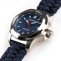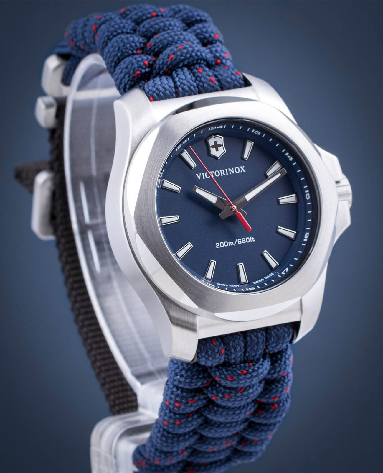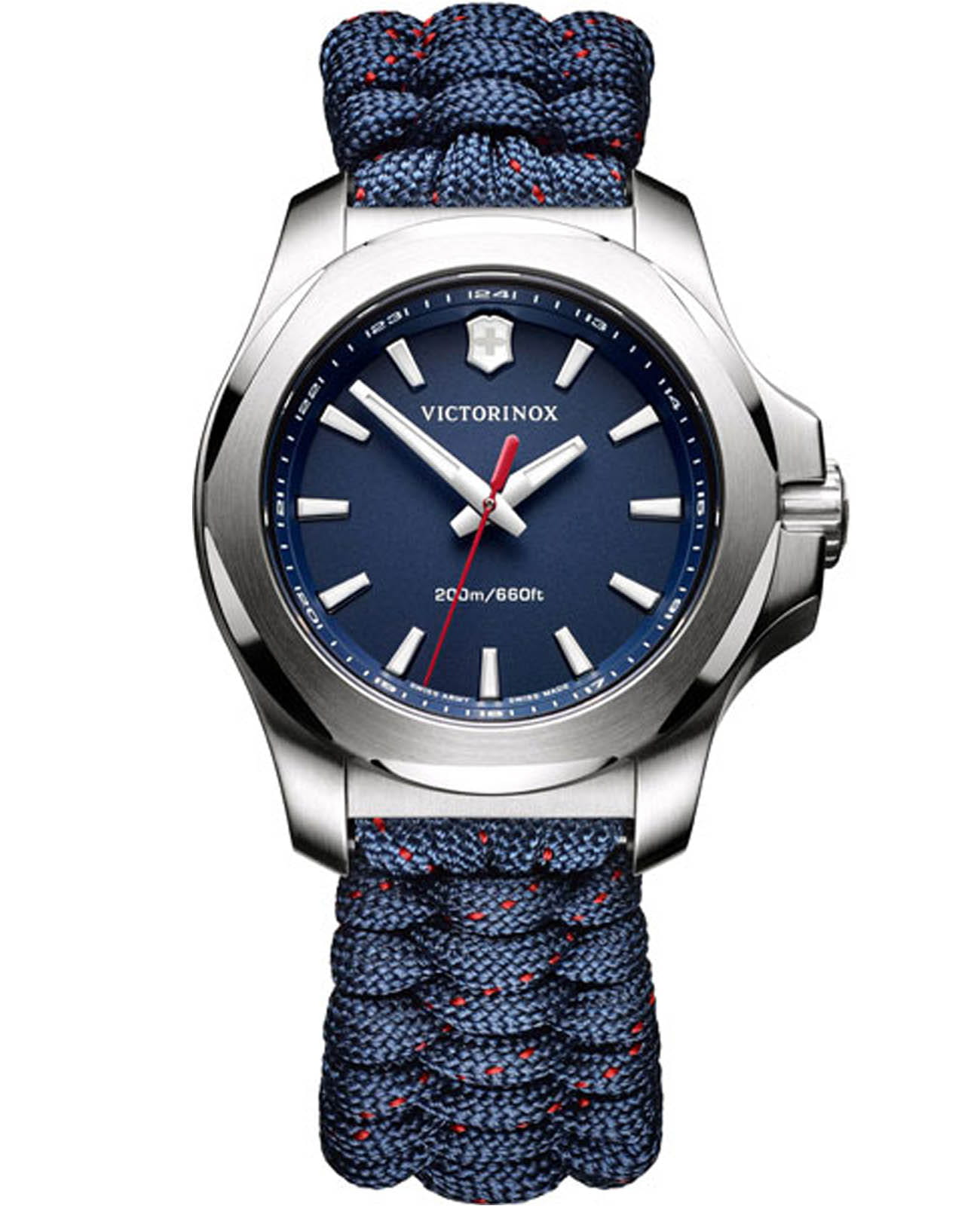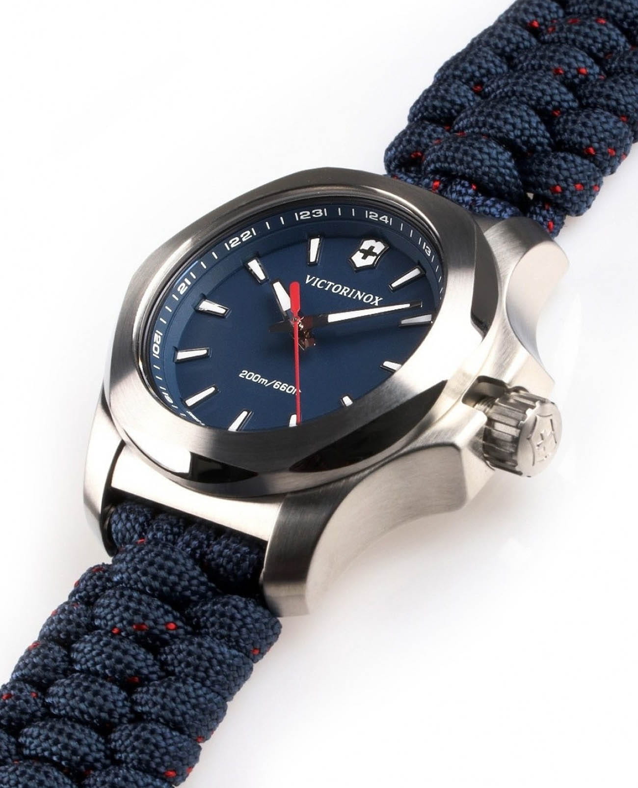 Женские швейцарские часы Victorinox I.N.O.X. V 241770. Сапфировое стеклоСапфировое стеклоПрочный и надёжный материал из кристалла сапфира синтетического происхождения, характеризующийся особой твёрдостью и устойчивостью к царапинам и повреждениям. с трёхслойным антибликовым покрытием. Корпус часов выполнен из нержавеющей стали 316L. Ремешок изготовлен из плетенной паракордовой стропы, длиной 2,5 метра и способной выдержать 250 кг. Влагозащита: 200 метров, позволит плавать, нырять и заниматься другими водными видами спорта. Стрелки и метки с люминесцентным покрытиемЛюминесцентное покрытиеПозволяет считывать показания времени в темноте. Производители наносят на стрелки, часовые индексы, безель или поверхность циферблата светонакопительный состав, дающий холодное свечение.. 12 и 24-часовой формат времени. В комплекте съемный защитный бампер.