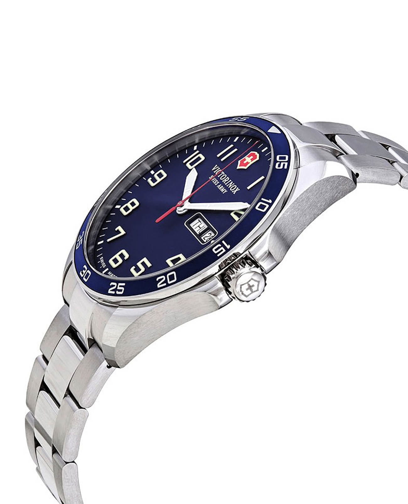 Мужские наручные часы Victorinox 241851 с надежным кварцевым механизмом. Сапфировое стеклоСапфировое стеклоПрочный и надёжный материал из кристалла сапфира синтетического происхождения, характеризующийся особой твёрдостью и устойчивостью к царапинам и повреждениям. с антибликовым покрытием. Степень водозащиты: 100 метров, позволит плавать, нырять и заниматься другими водными видами спорта. Корпус и браслет часов выполнены из нержавеющей стали. Окошки дня недели и даты находятся в положении 3 часа. Стрелки и метки с люминесцентным покрытиемЛюминесцентное покрытиеПозволяет считывать показания времени в темноте. Производители наносят на стрелки, часовые индексы, безель или поверхность циферблата светонакопительный состав, дающий холодное свечение.. Стальной браслет на застёжке-бабочке с кнопкамиЗастёжка "бабочка"Такой вид застёжки дополняется предохранителями, помогающими избежать случайного раскрытия браслета. Обладают изящным исполнением. .