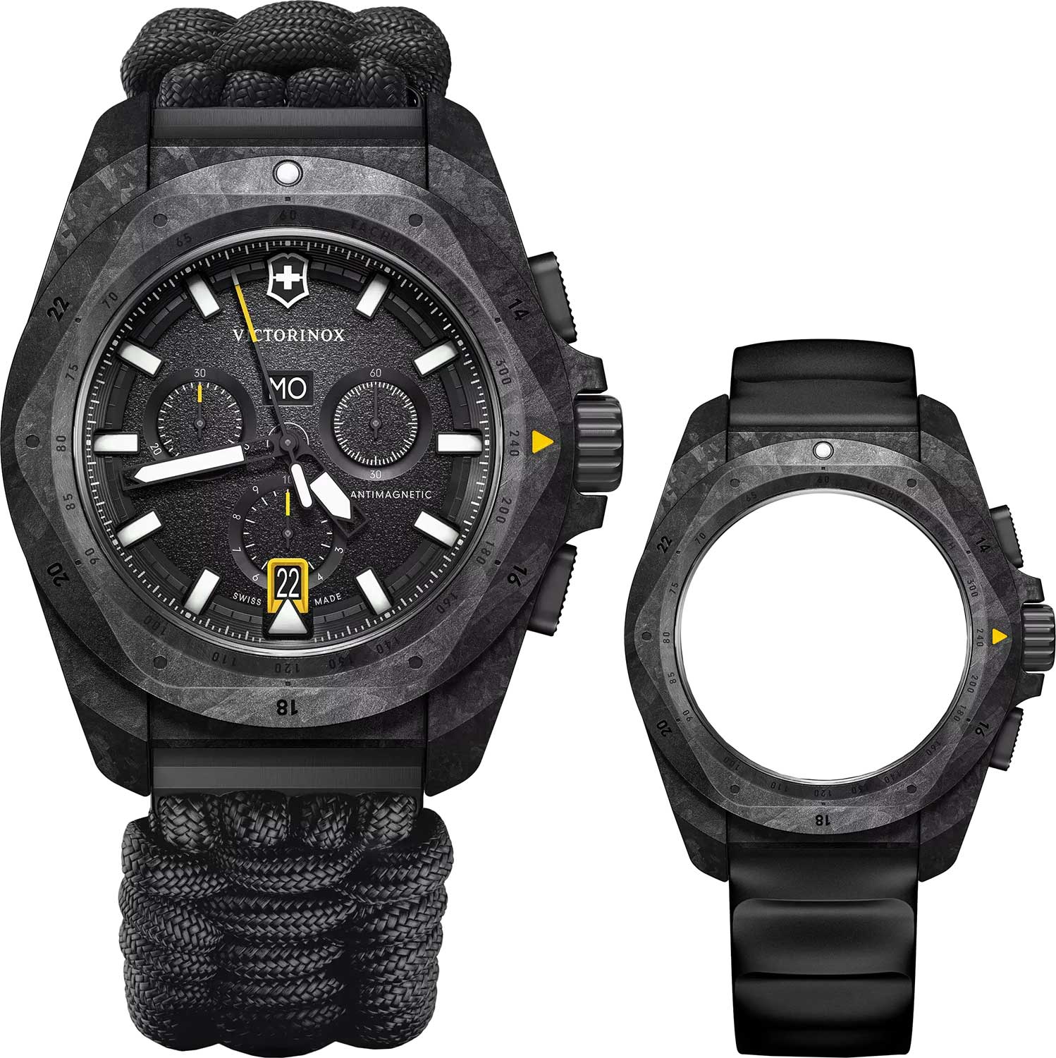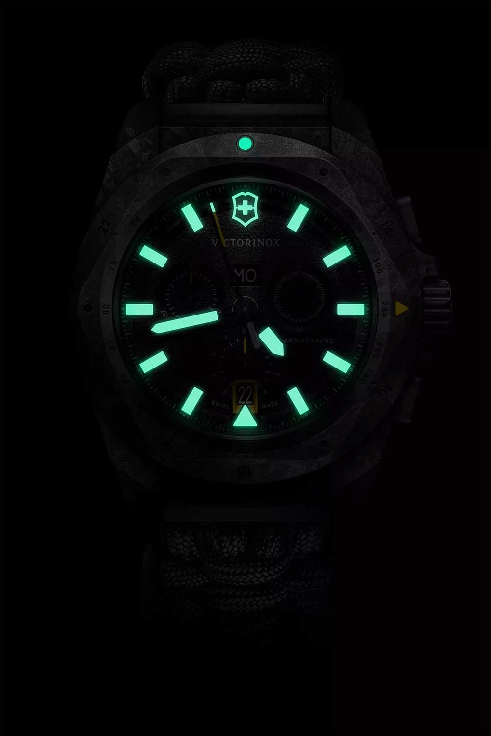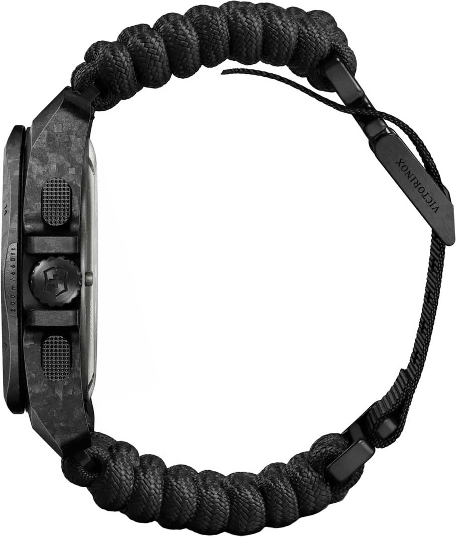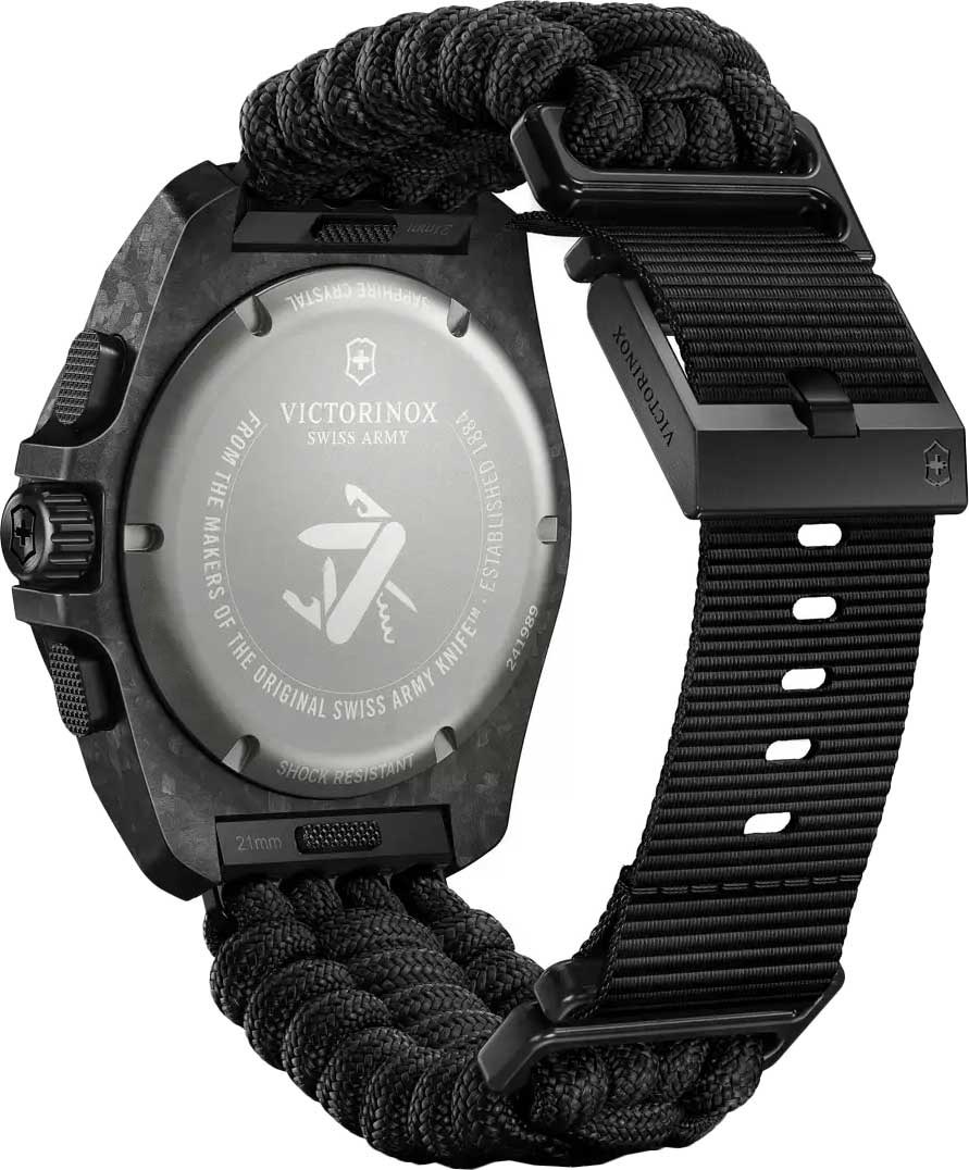 Мужские швейцарские часы-хронографХронографФункция позволяет измерять отрезки времени с особой точностью: часы, минуты, секунды. Верным признаком хронографа является наличие на циферблате 3 дополнительных окошек-счётчиков. Victorinox I.N.O.X. V 241989.1. Сапфировое стеклоСапфировое стеклоПрочный и надёжный материал из кристалла сапфира синтетического происхождения, характеризующийся особой твёрдостью и устойчивостью к царапинам и повреждениям. с трёхслойным антибликовым покрытием. Корпус часов выполнен из титана. Влагозащита: 200 метров, позволит плавать, нырять и заниматься другими водными видами спорта. Стрелки и метки с люминесцентным покрытиемЛюминесцентное покрытиеПозволяет считывать показания времени в темноте. Производители наносят на стрелки, часовые индексы, безель или поверхность циферблата светонакопительный состав, дающий холодное свечение.. В комплекте съемный защитный бампер. В комплекте сменный каучуковый ремешок. Окошко даты находится в положении 6 часов. Окошко дня недели находится в положении 12 часов. Уникальное плетение паракордового ремешка разработано в сотрудничестве с Naimakka. Ремешок можно расплести в экстренном случае на отдельные жгуты, которые выдерживают нагрузку до 250кг. БезельБезельВнешний ободок, закрепляющий стекло. В спортивных часах так называется поворотное кольцо с делениями на циферблате, выполняет роль таймера – замеряет отрезки времени на шкале. Неподвижный безель – элемент декора. Однонаправленно вращающийся безель на дайверских часах позволяет фиксировать моменты погружения и выныривания на поверхность. с PVD-покрытиемPVDУльтратонкое покрытие наносится в технике вакуумного напыления, сочетает в себе нитрид титана особой прочности со слоем золота или оксида хрома. Несёт в себе декоративную или защитную функцию..