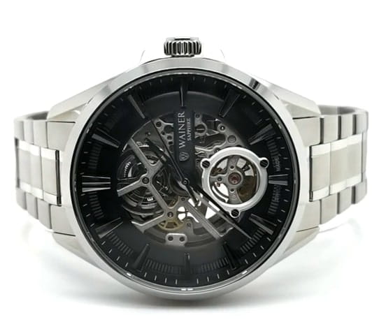 Модель Wainer WA.25511-A сочетает элегантность, швейцарское качество и техническое совершенство. Корпус диаметром 46 мм выполнен из нержавеющей стали 316L, обеспечивая прочность и долговечность. Скелетонизированный циферблат раскрывает сложность автоматического механизма Landeron Depa DP2072, а сапфировое стеклоСапфировое стеклоПрочный и надёжный материал из кристалла сапфира синтетического происхождения, характеризующийся особой твёрдостью и устойчивостью к царапинам и повреждениям. защищает дисплей от царапин и механических повреждений. Прозрачная задняя крышка подчеркивает эстетику работы механизма, а браслет из нержавеющей стали 316L на застёжке-бабочке с кнопкамиЗастёжка "бабочка"Такой вид застёжки дополняется предохранителями, помогающими избежать случайного раскрытия браслета. Обладают изящным исполнением. гарантирует надежную фиксацию и комфортное ношение. Водонепроницаемость до 50 метров защищает часы от случайных брызг и дождя. Wainer WA.25511-A — это стильный аксессуар для мужчин, ценящих швейцарское качество, современный дизайн и мастерство часового искусства.
